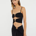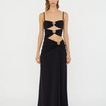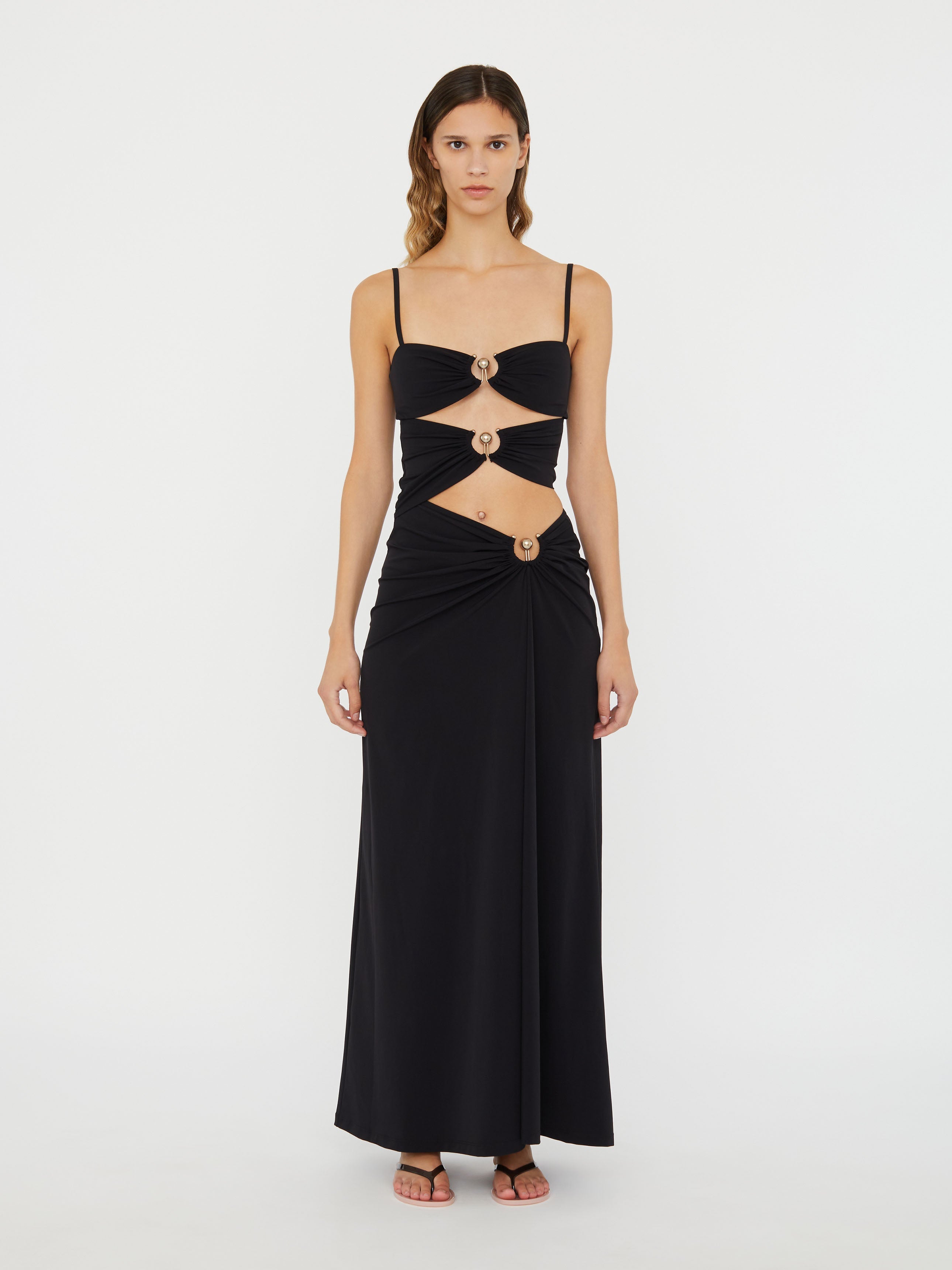 Hooked with a sculpted metal adornment, this maxi a-line dress features signature cut-outs, ruched and anchored by signature orb hardware.