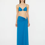 Hooked with a sculpted metal adornment, this maxi a-line skirt features an open split front, ruched and anchored by signature orb hardware.