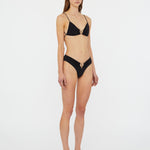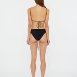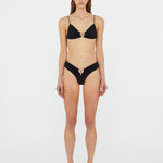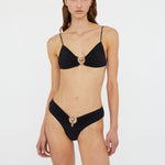 Sculptural orbit hardware pierces matte lycra for elevated poolside dressing. This wide band brief is cut high at the waist and ruched at the centre.