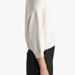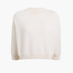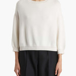 A milano-stitched pullover designed to highlight the softness and structure of an airy, lofty blend of cashmere and mohair. Dropped shoulder seams enhance the unique, deliberately rounded silhouette. Refined by ribbing at wide crewneck, elbow-length sleeves, and hem.