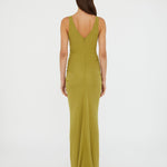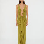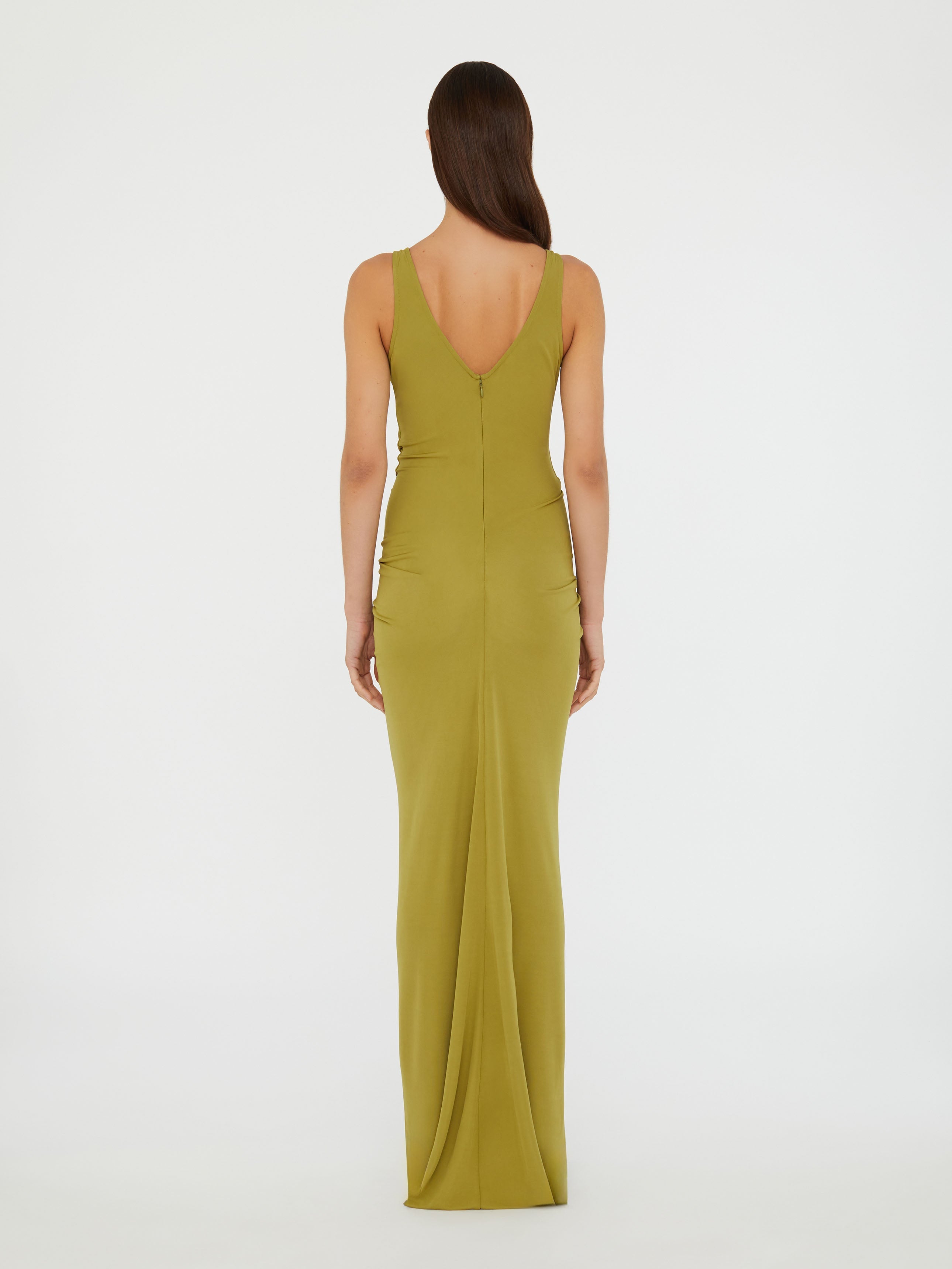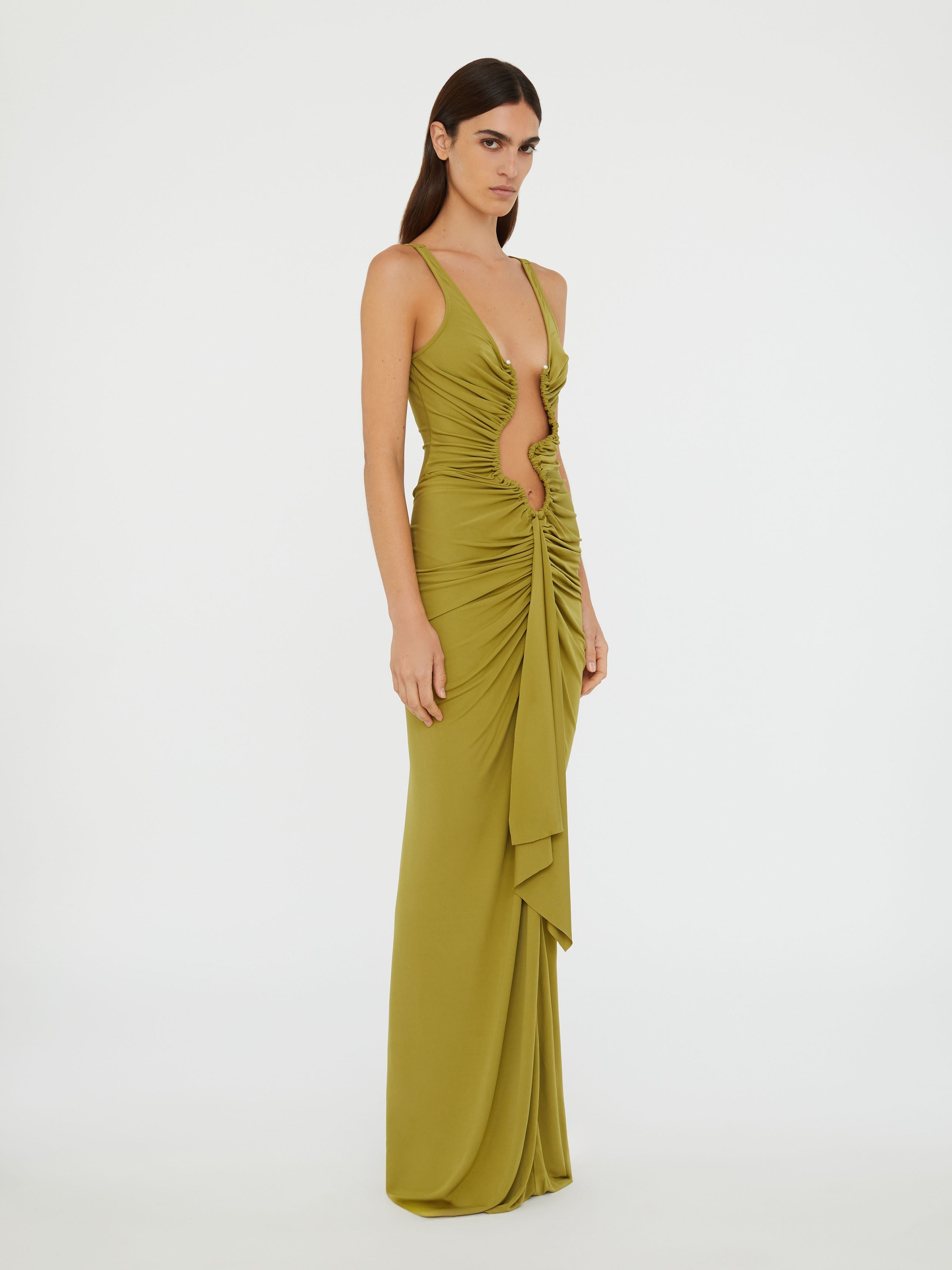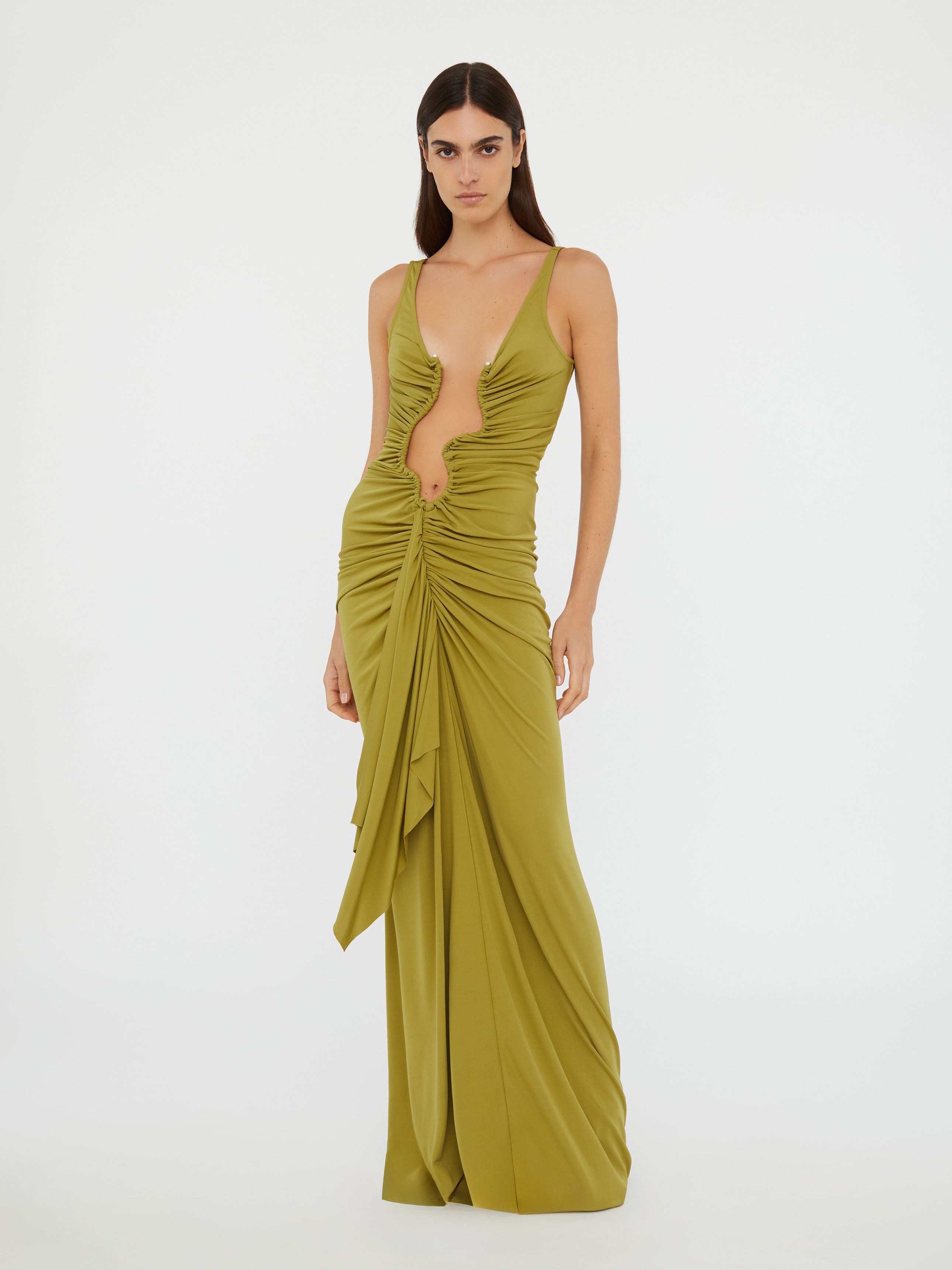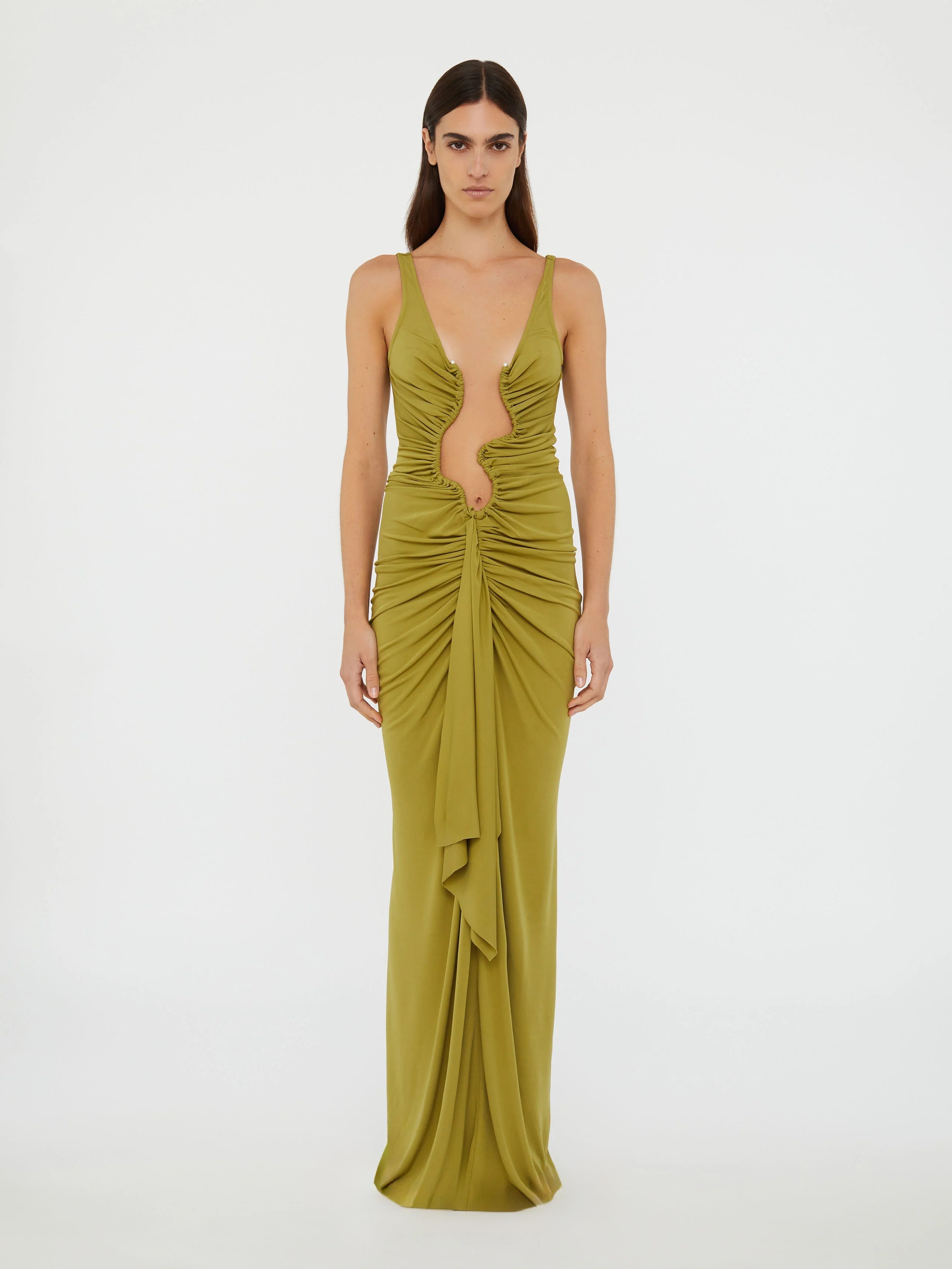Signature compact rib fabrication is grafted with free forming line with this sculpted wire cut-out column dress. Artfully constructed with a cascading draped panel and bespoke copper hardware.
