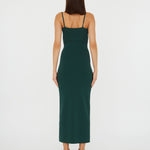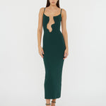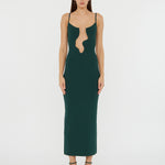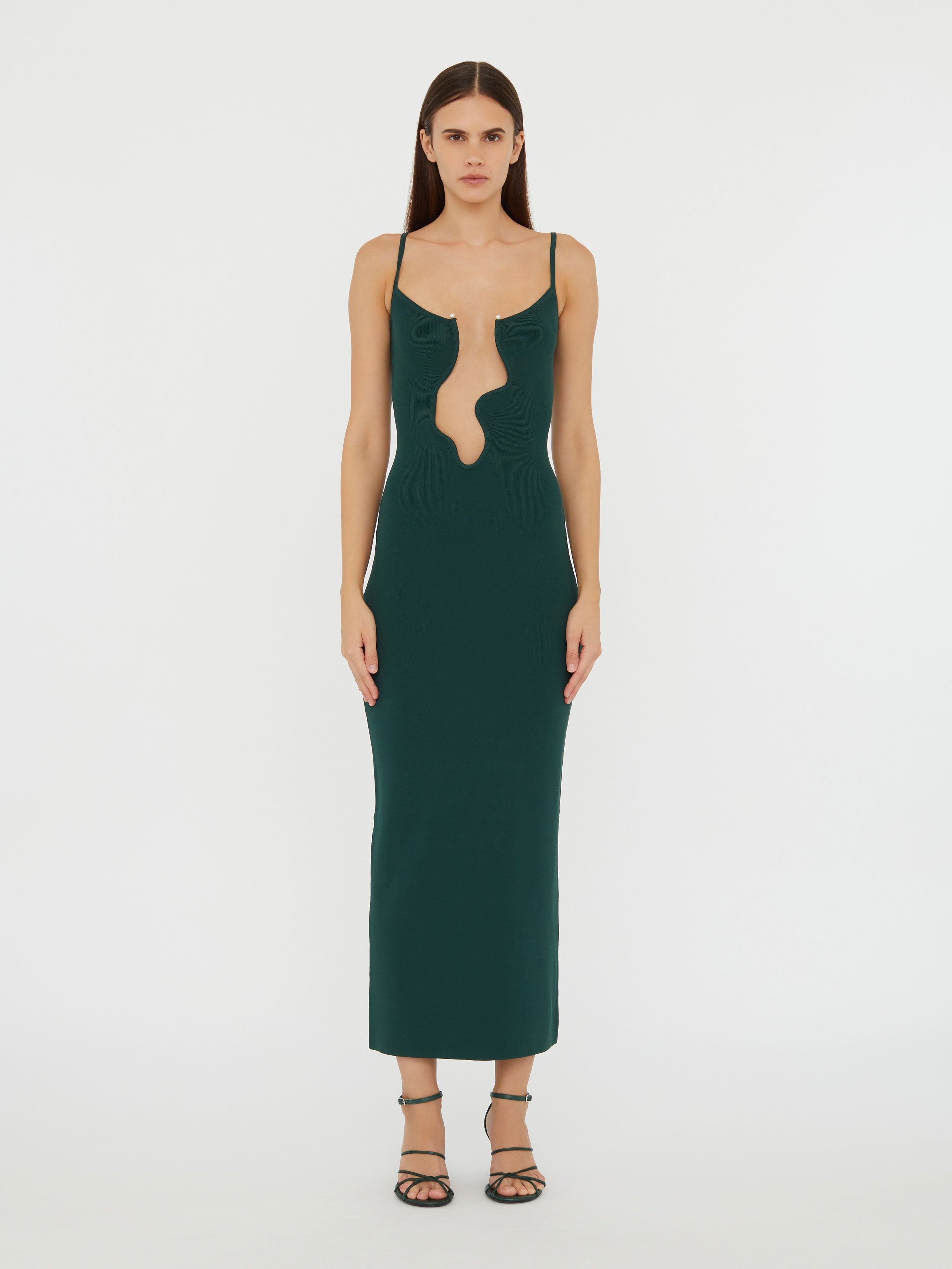 Our signature compact rib fabrication is grafted with free forming line with this sculpted wire cut-out column dress. Finished with pearlescent hardware.