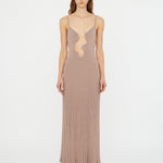 Our signature compact rib fabrication is grafted with free forming line with this sculpted wire cut-out dress. Finished with pearlescent hardware and sunray pleated skirt.