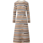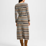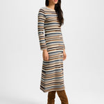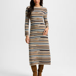 The essential sweater dress with flattering, feminine shape. The Sanders is spun from an Italian wool-cashmere blend for a soft, luxurious feel—perfect for cooler months. Designed to softly hug the body, it’s fitted throughout the bodice before falling to a relaxed, A-line skirt. Knit with a horizontal stripe pattern in a variety of brown, blue, and white tones, it’s finished with a classic crewneck and a braided rolled trim for an elevated touch. Pair with tall boots or ballet flats for an effortless look.