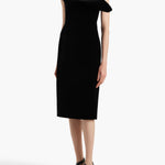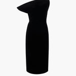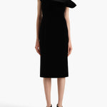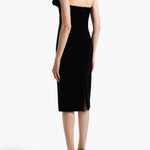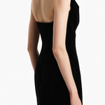 A dynamic, sculptural interpretation of the strapless dress in compact velvet selected for its softness and slight sheen. Draped bodice with handkerchief detail and power mesh boning. Concealed zipper at back.