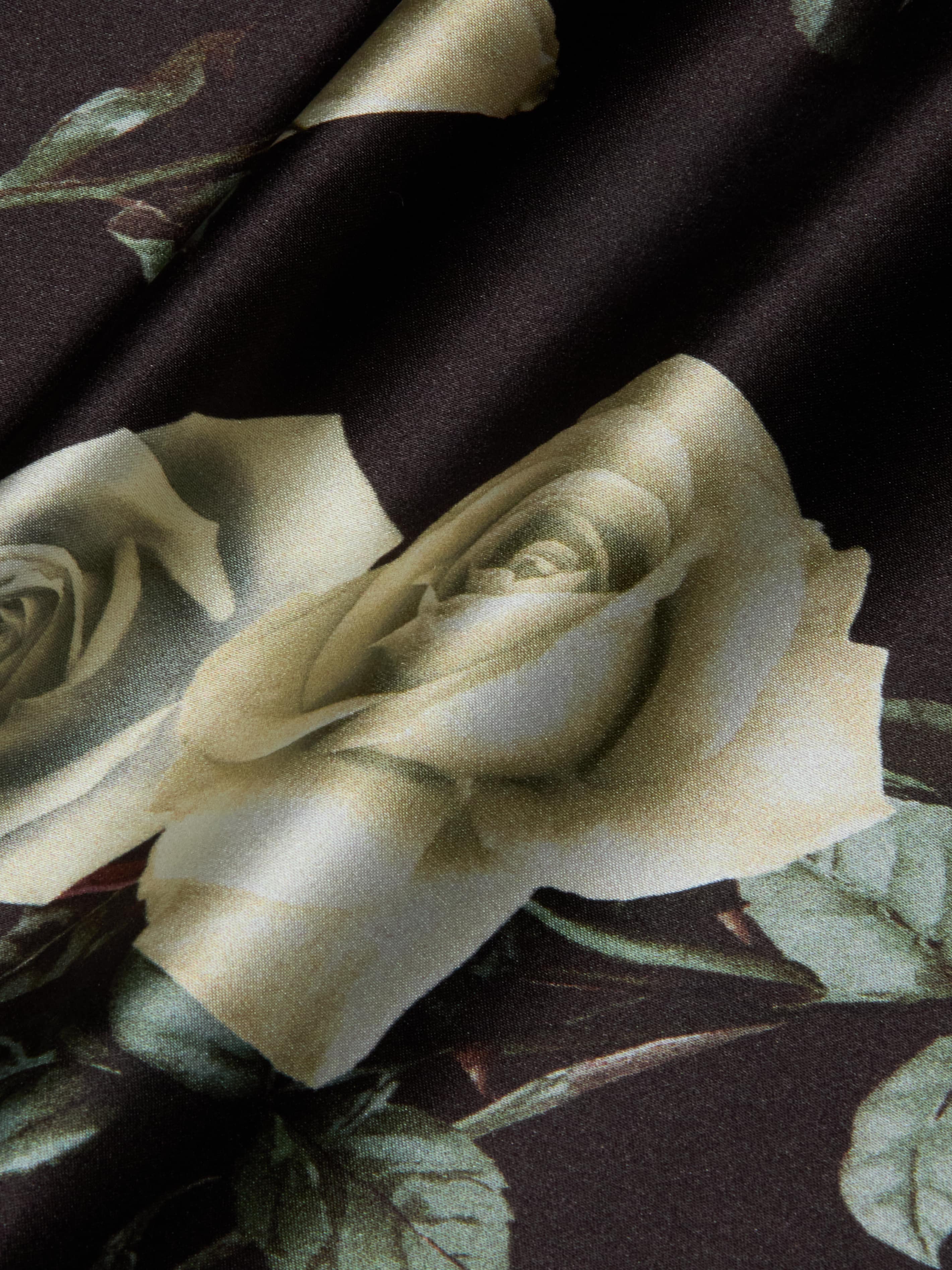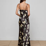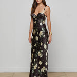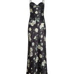 The Sayla silk gown melds vintage glamour and modern sophistication. Constructed with molded cups secured by a traditional hook and eye closure, this event-ready style offers a secure, supportive fit. Now in black with a romantic rose print.