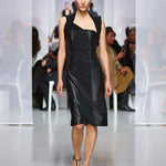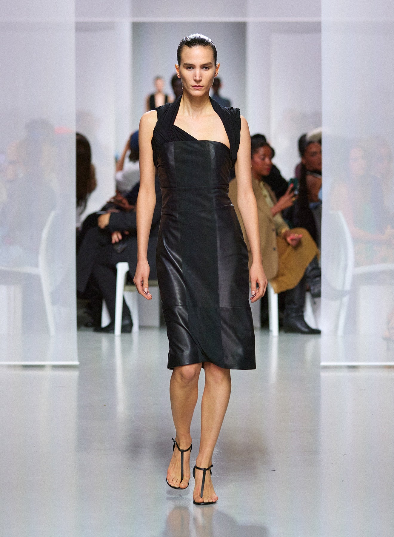 A discourse between dress codes; the casual morphs into delicate, elegant drapes. Fine Lamb Nappa is pigmented and placement cut to create an illusion of wear and patina. An artfully constructed midi dress which starts to flow and wrap into jersey tee form.