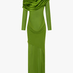 Blending structure and sensuality, sheer silk georgette is intentionally draped across the shoulders and hip, with a layered train at the back which appears to fall away from the body.