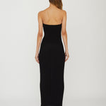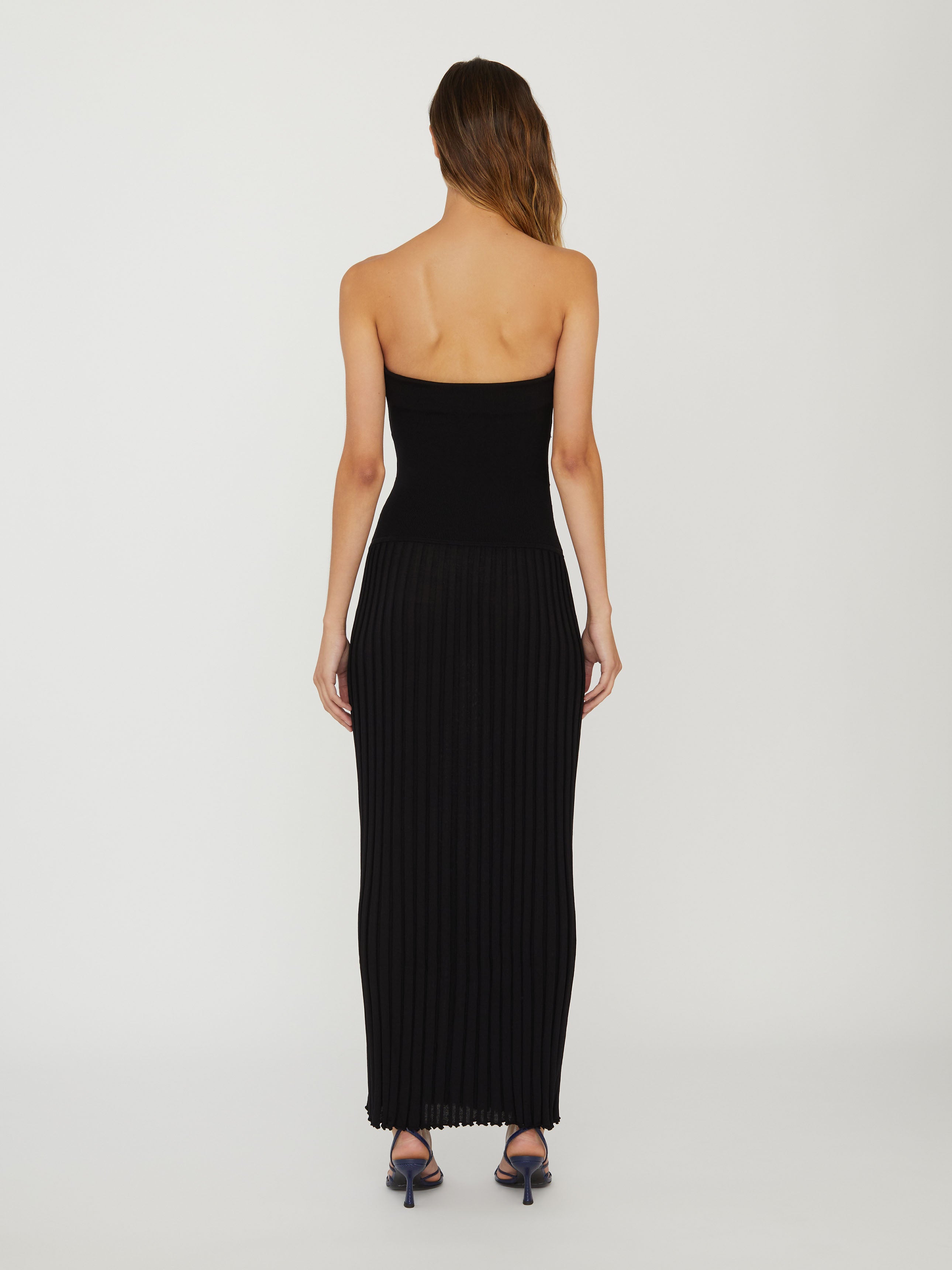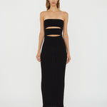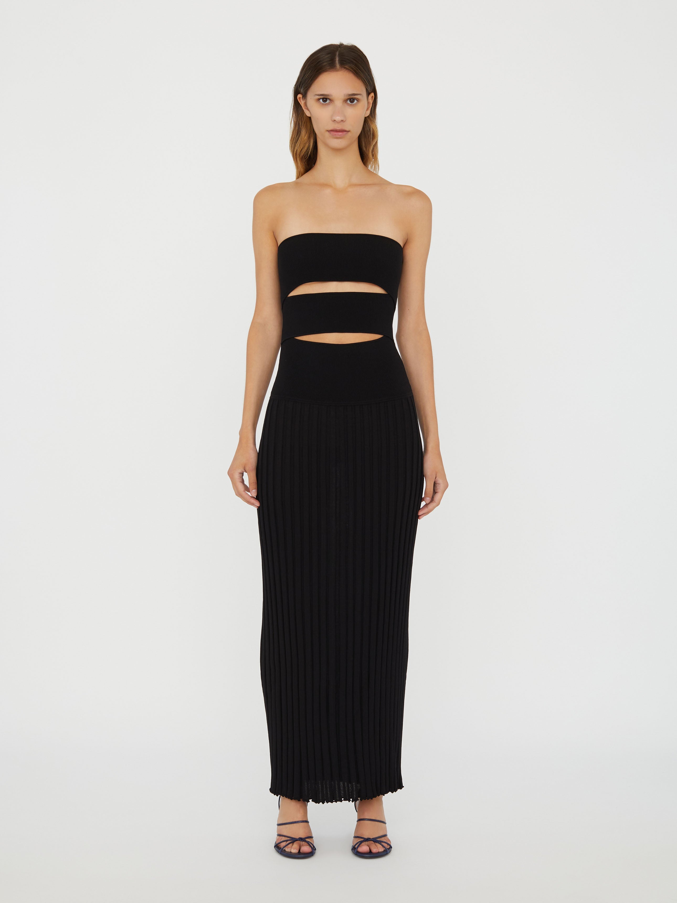 Vital form meets sculpted ribbing with this slashed rib knit column dress. Fitting close to the body with considered cut-outs and a ribbed straight skirt.