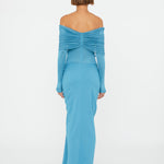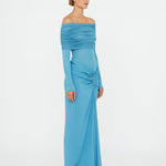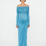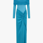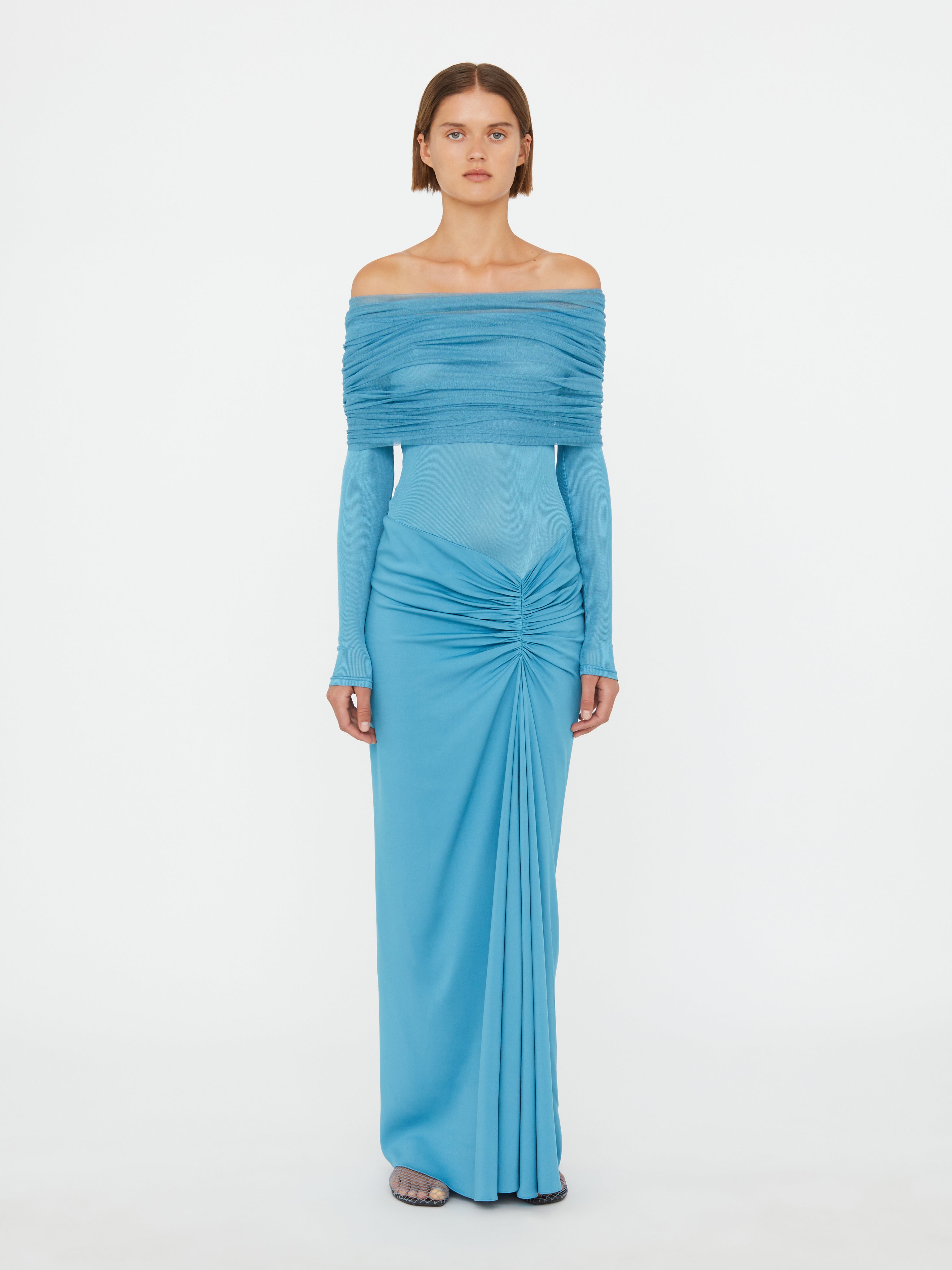 Crafted in soft stretch jersey and defined by an off-shoulder neckline with layered ruching. A sheer mesh bodice contrasts with the gathered skirt, ruched at the hip. Fitted sleeves extend past the wrist.