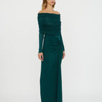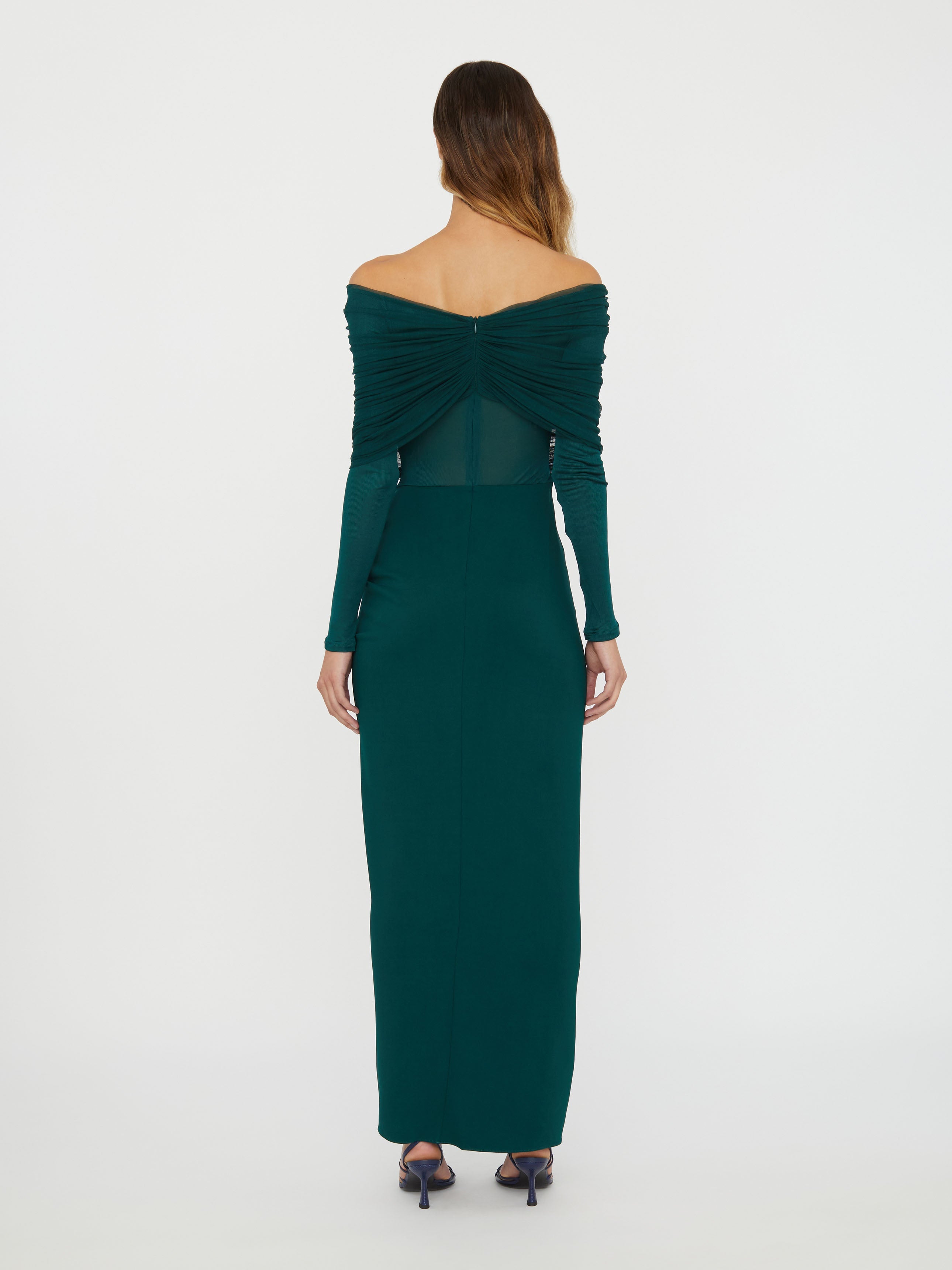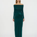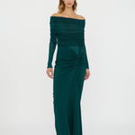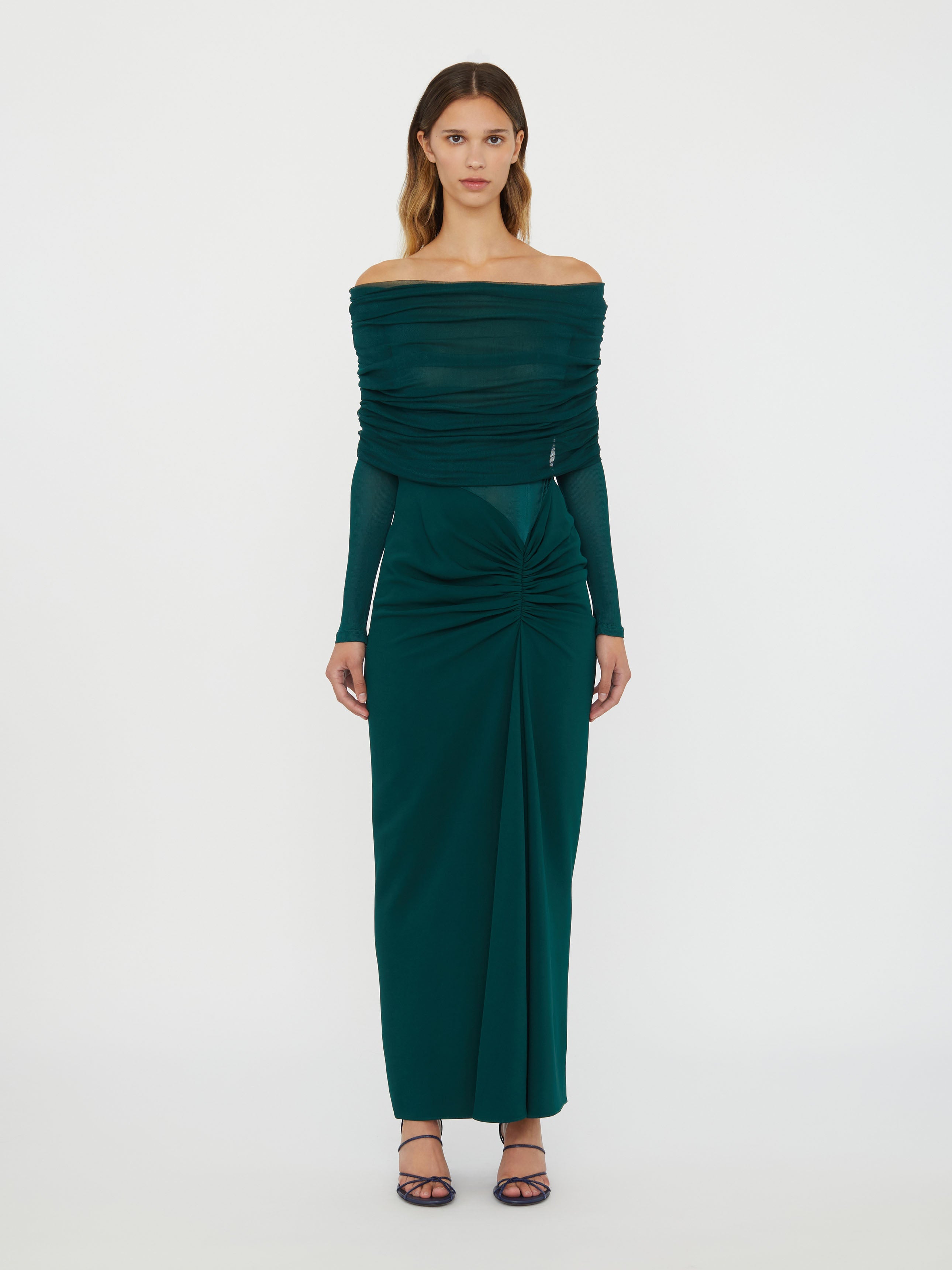 Evolved from the brands signature veiled silhouette, this off the shoulder long sleeve maxi dress is wrapped in a sheath of transparent silk tulle, finished with a refined rib bodice and ruched woven skirt.