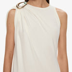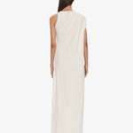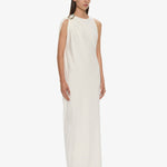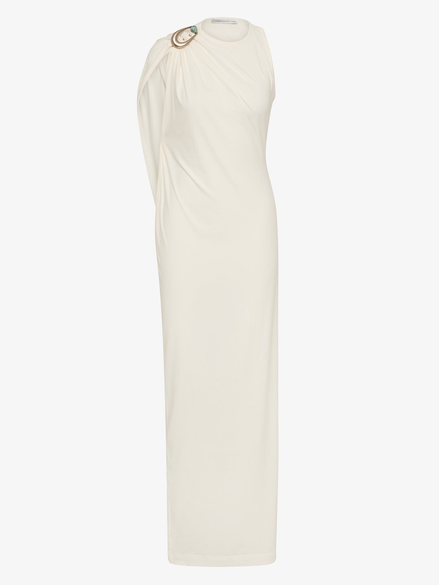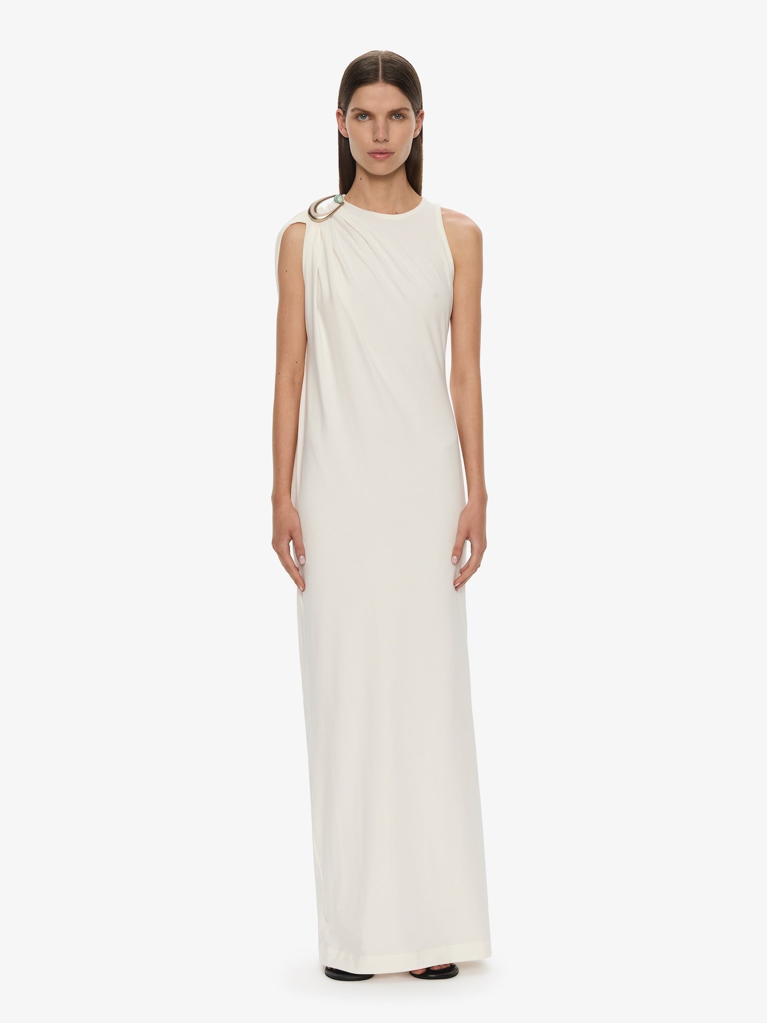 A sleeveless column dress cut from soft high-twist cotton jersey, elevated through asymmetry and hardware detailing. The silhouette is defined by a gathered shoulder, anchored with custom brushed metal ring hardware, balancing fluid drape with sculptural precision.