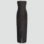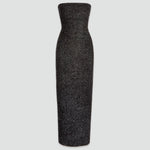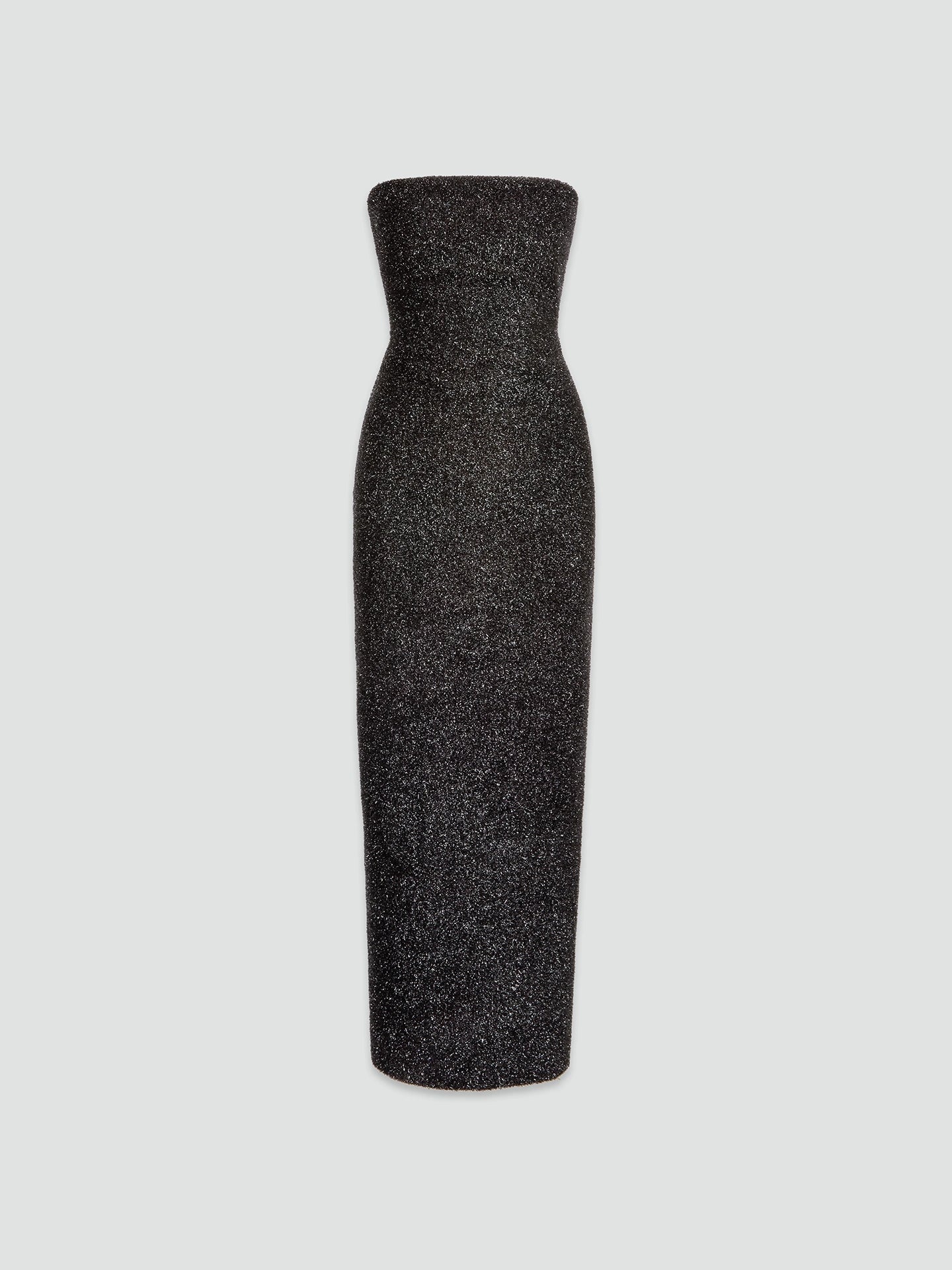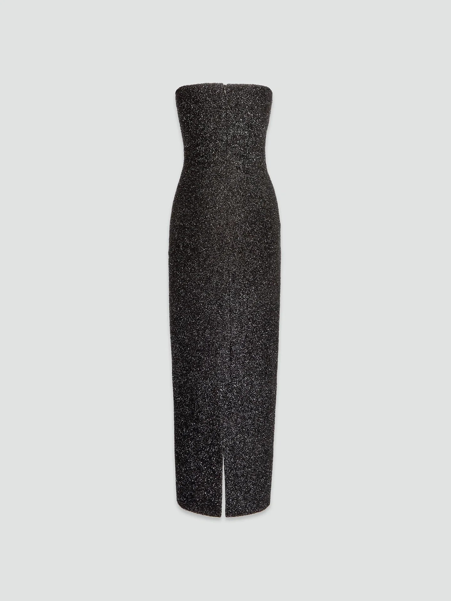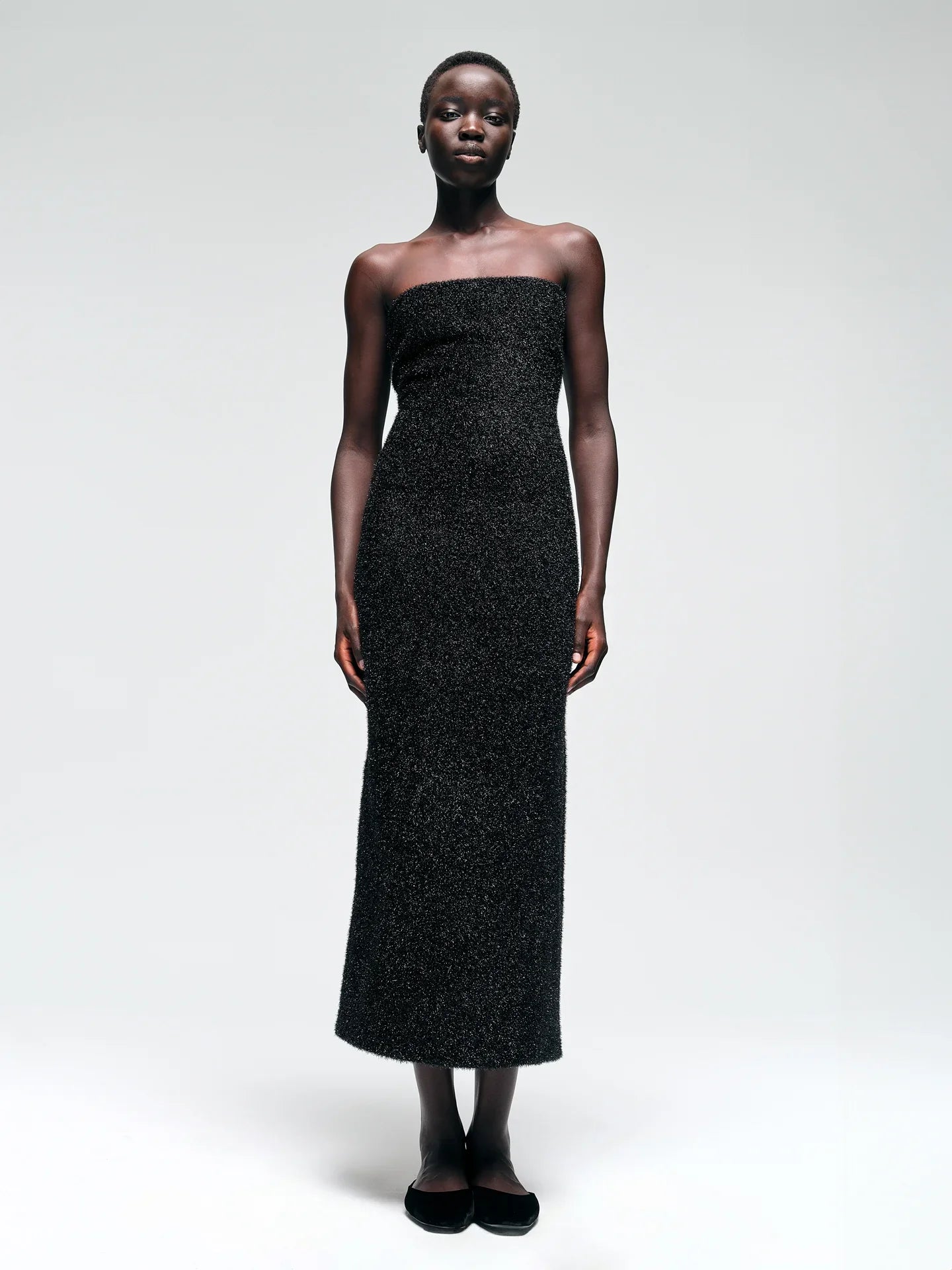 A mid length strapless dress with a straight neckline, fitted bodice, and column silhouette. Made in a soft wool blend knit that boasts metallic sparkle and short fringe texture, and lined in pure silk organza.