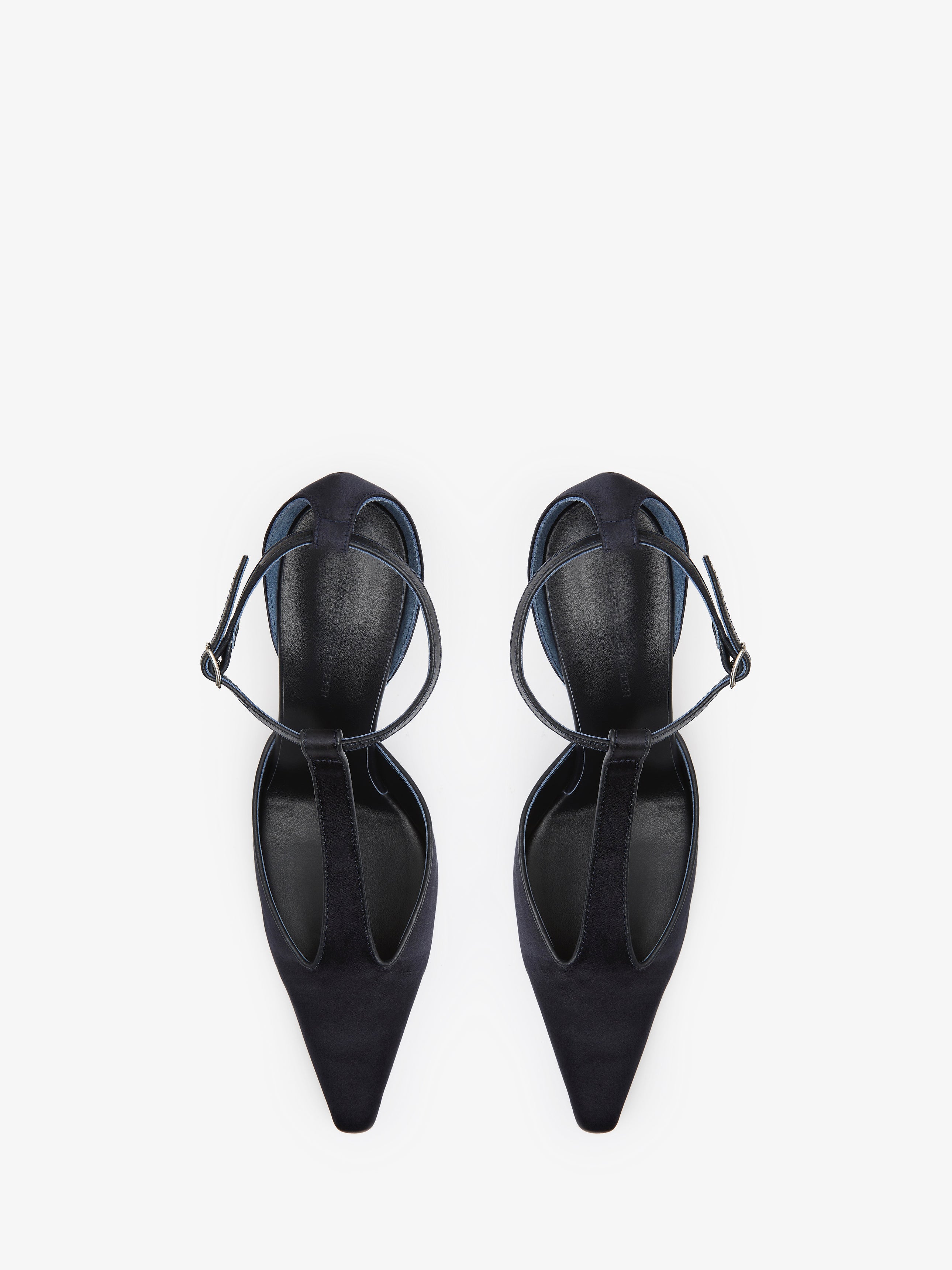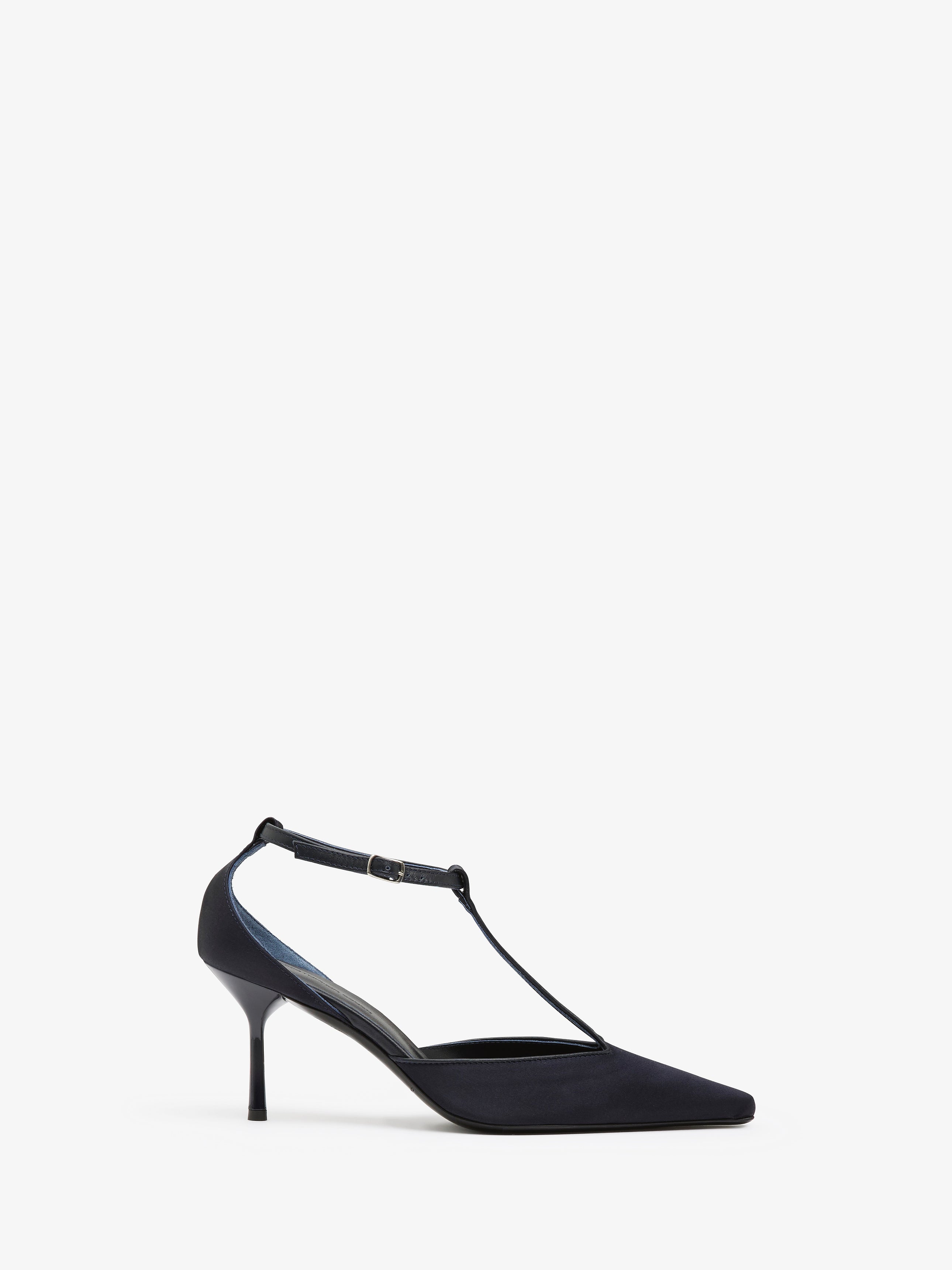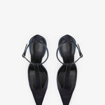 Crafted in silk satin with a refined, architectural silhouette. A pointed toe elongates the foot, while the delicate T-strap and curved heel add an elevated sense of proportion. Secured by a slim ankle strap with buckle closure, the design merges soft structure with evening precision.