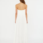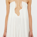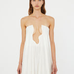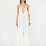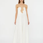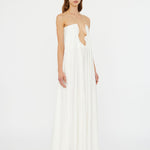 Embodying timeless beauty, in convergence of past and present, merging tradition with modernity. Evolved from the brands signature Salacia, sculptural hardware anchors a plunging neckline in this strapless gown. Finished with a generously volumed hammered silk hem.