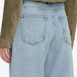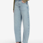 The best-selling Bubble, now with a shorter 27" inseam. The exaggerated take on the trending barrel silhouette is a unique fit and instant closet necessity. With a flattering high rise, these jeans have a curved outseam for a playful bubble effect. Note the light blue wash and raw, fringed hem for a pre-loved look.