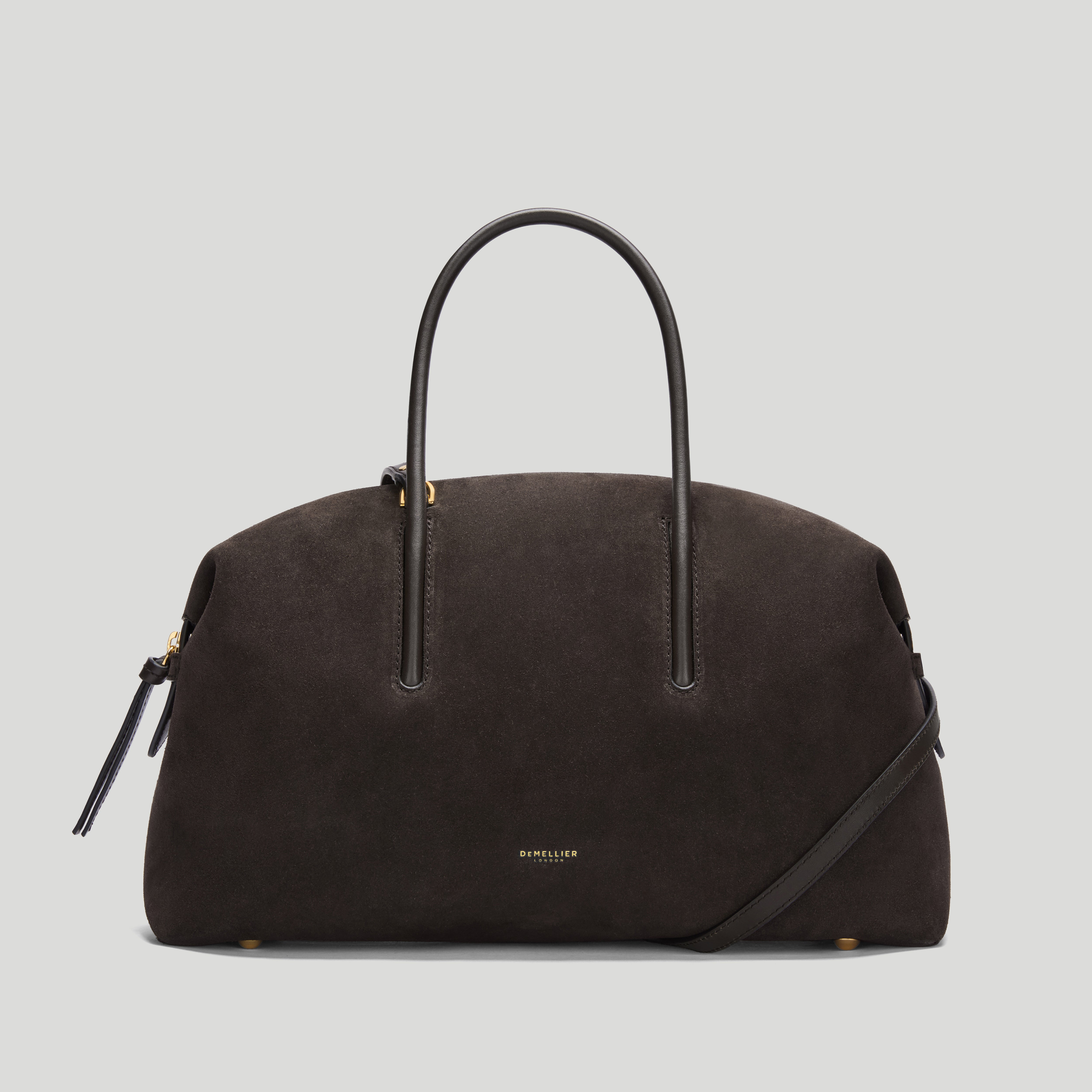 Exterior: Flexible, tubular leather handles designed to sit perfectly on the crook of the arm. Foil-embossed DeMellier logo. Tabs on the sides tuck into leather loops and fasten with snap buttons to give the bag its characteristic roundness, with the option to unfasten for increased capacity. Removable, adjustable crossbody strap is fastened with bespoke DeMellier gold-plated rings and mini sam browns. Base protected by metal feet.