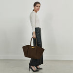Exterior: Double top handles, metal feet, unique triangular fold design, foil embossed DeMellier logo.