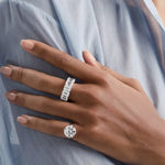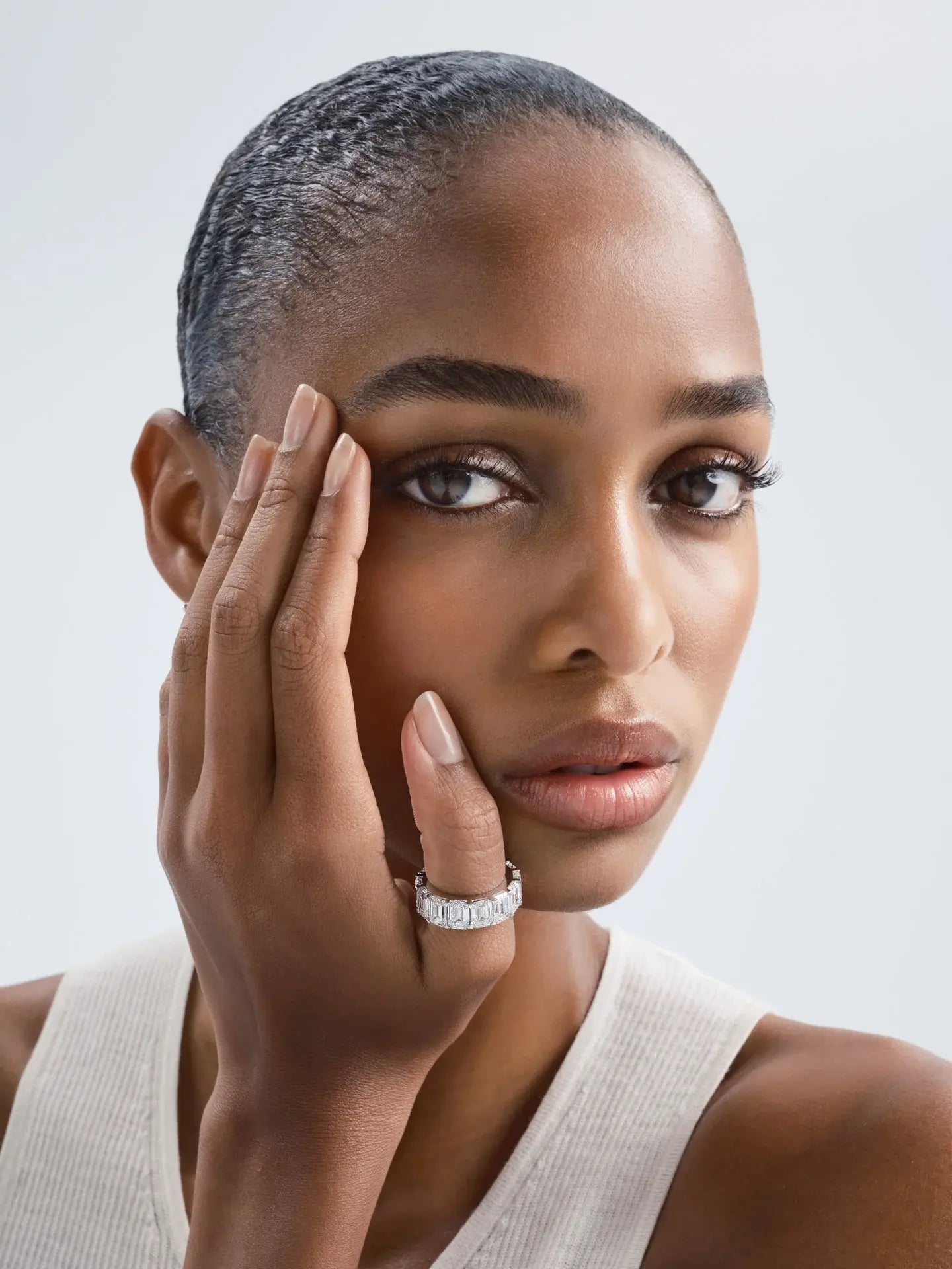 An ongoing row of emerald-cut diamonds, totaling 14 carats and set in 14k white gold will wrap around your thumb or middle finger as you project a shimmering stamp of approval or conversely express disdain. Each stone is precision-set for a seamless silhouette with bold, graphic clarity. Best when styled with the racquet bracelet in Rose. Surfs up.