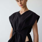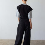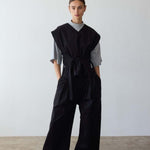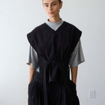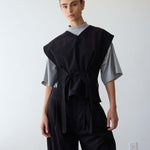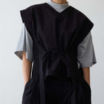A smock style vest offers a pop over layer with tie waist that creates a flattering cinched waist effect. Trapunto stitch at the extended armhole and side seam creates texture and Japanese obo inspired detail. Pairs beautifully with the weekend woven shirt, the Primm sweater, the Turtleneck tee or Mock Neck tee.