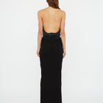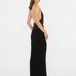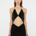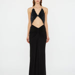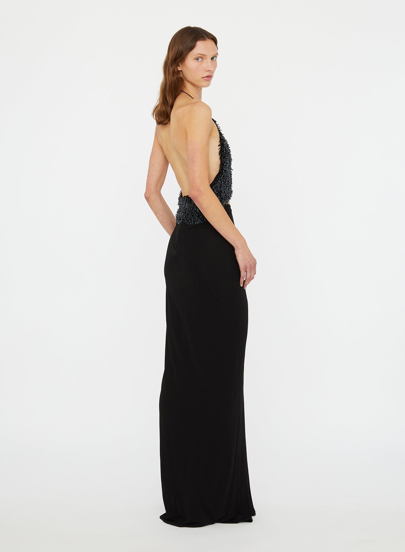 A bugle bead bodice attaches to a dry jersey construction. Artfully constructed with an exposed midriff and intentional ruching at the skirt centre.