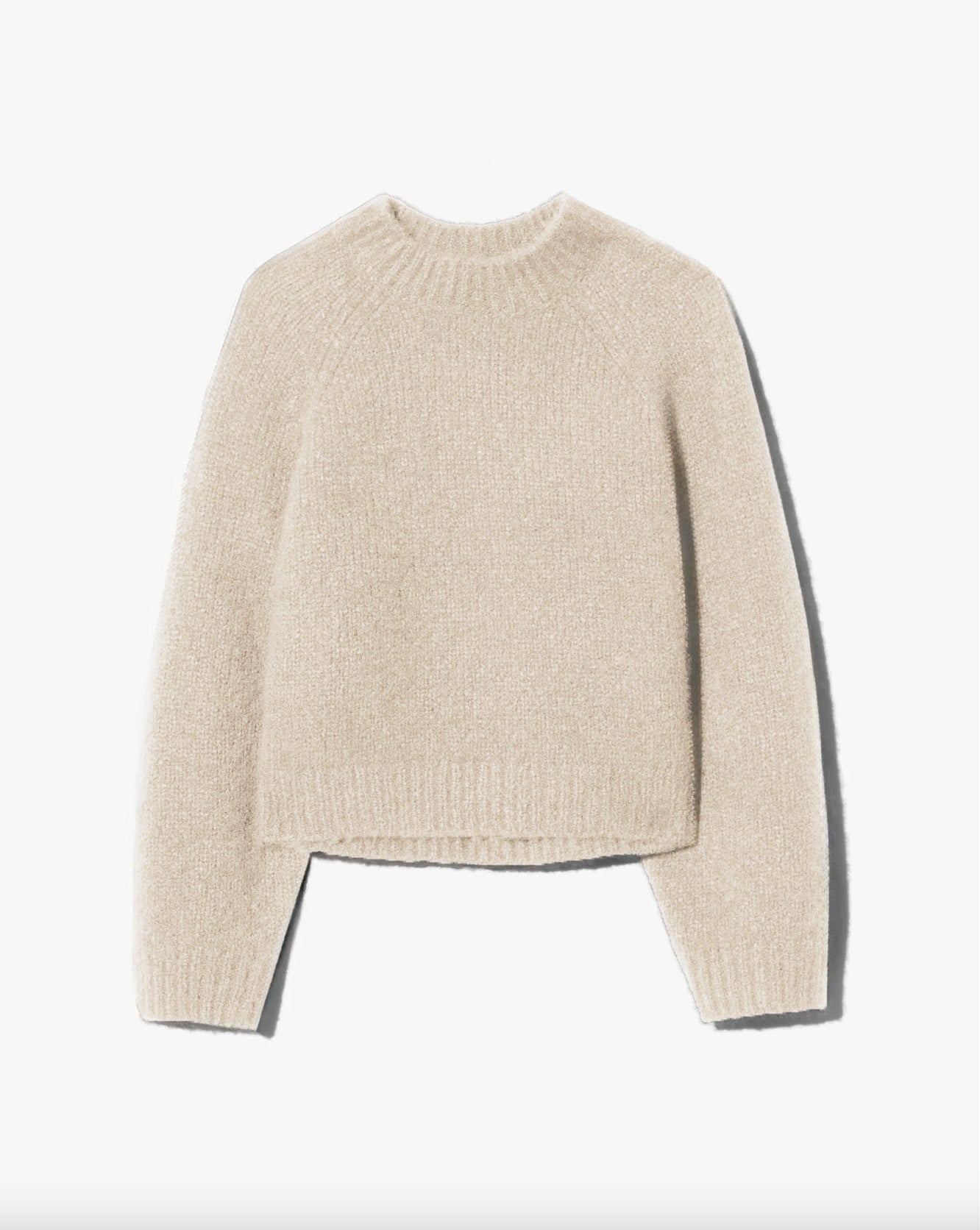 Heavyweight relaxed sweater. High, wide neck trim. Regular length body. Raglan arm hole. Fashioning along arm hole. Rib start at hem and sleeve. Signature center back cable knit detail.