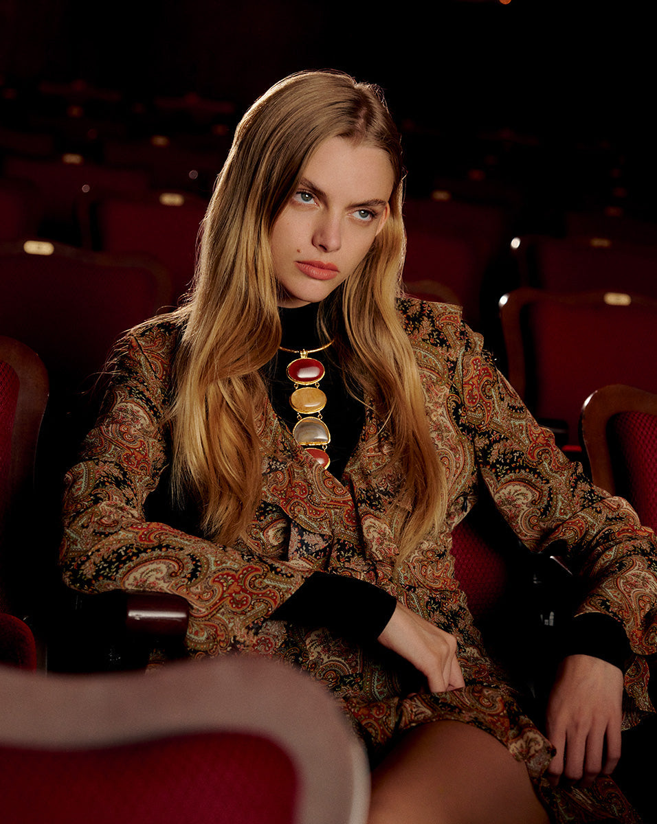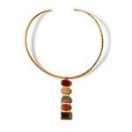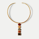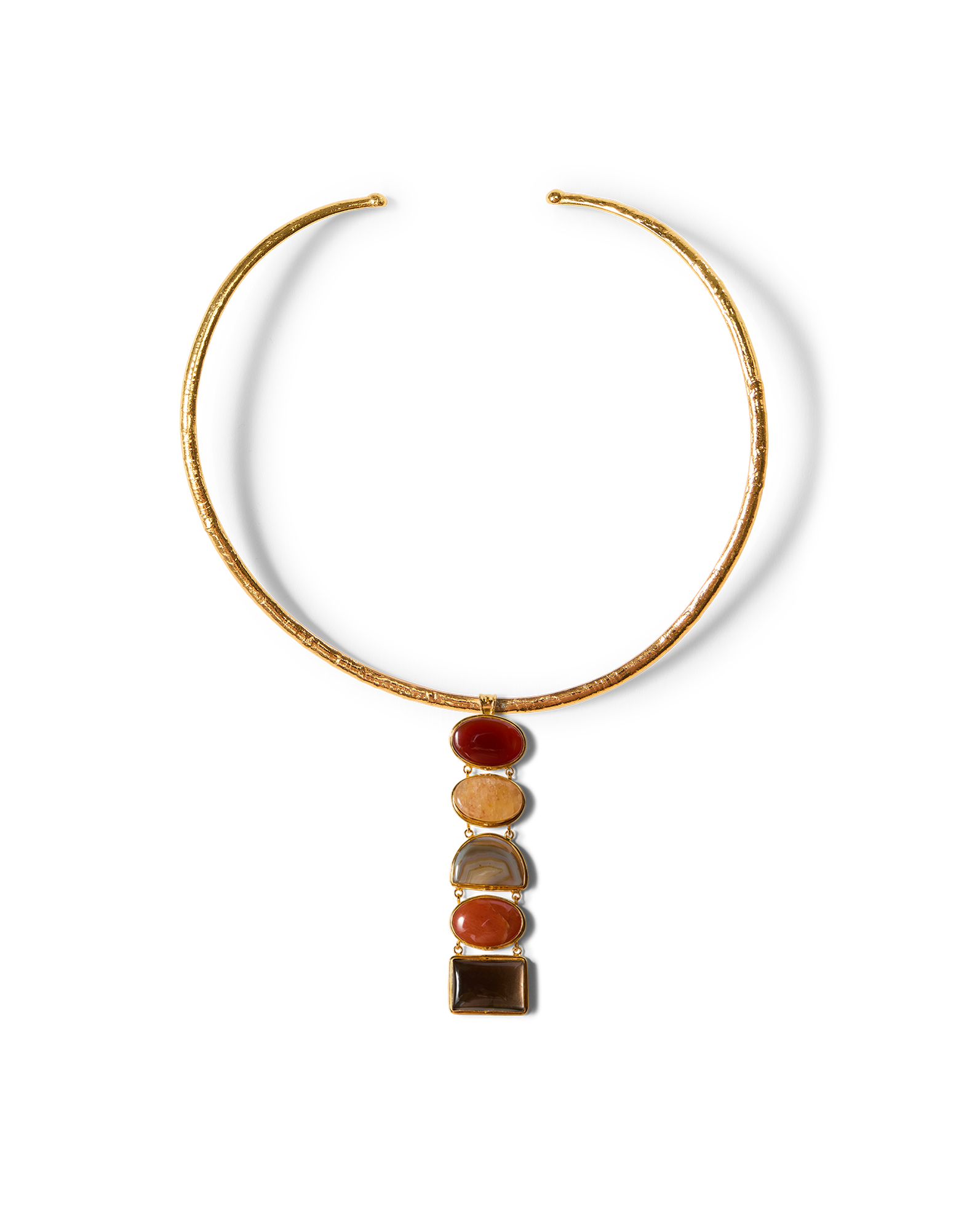The piece that inspired the full Veronica Beard x Sylvia Toledano capsule—colorful, meticulously crafted talismans that embody a luxe bohemian spirit and complement our Fall 2025 collection. Designed in Paris and handcrafted in India from 22k gold-plated brass, the Torque is a bold, sculptural collar necklace featuring a vertical pendant of five bezel-set semi-precious cabochons sourced from Jaipur: carnelian, golden jasper, natural onyx, red aventurine, and smoky quartz. A striking statement piece, it’s destined to be the focal point of any look.