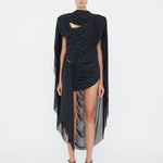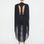 Blue on black warped polka dot print channels low-tech 90s and the subtle chaos of a summer rain shower. Warped dot print is gathered, tucked and cinched to distortion in these lavishly draped mini dress. Cascading drapes amplify dimension and movement.