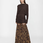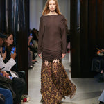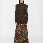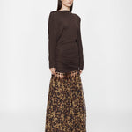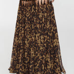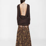 A sculptural silhouette suspended in motion. The Tortoiseshell Droplet Jersey Gown is cut in soft stretch jersey, draped asymmetrically across the hips and anchored with hand-poured resin droplets. The skirt falls into sheer, tortoiseshell-printed chiffon—offering lightness and movement in contrast to the grounded top.