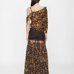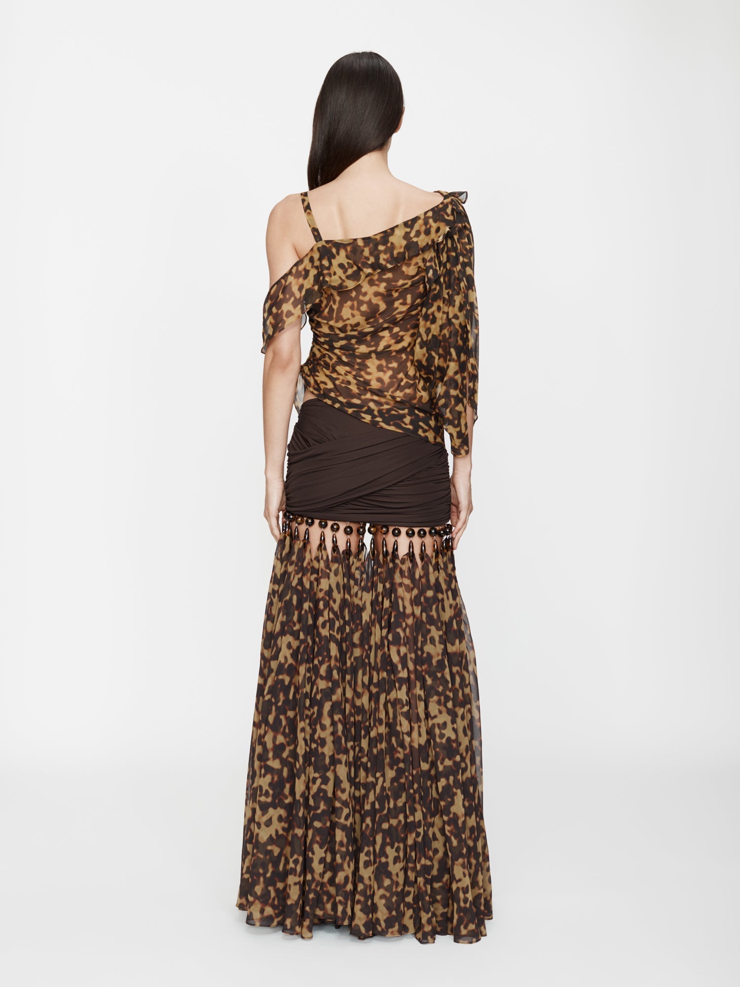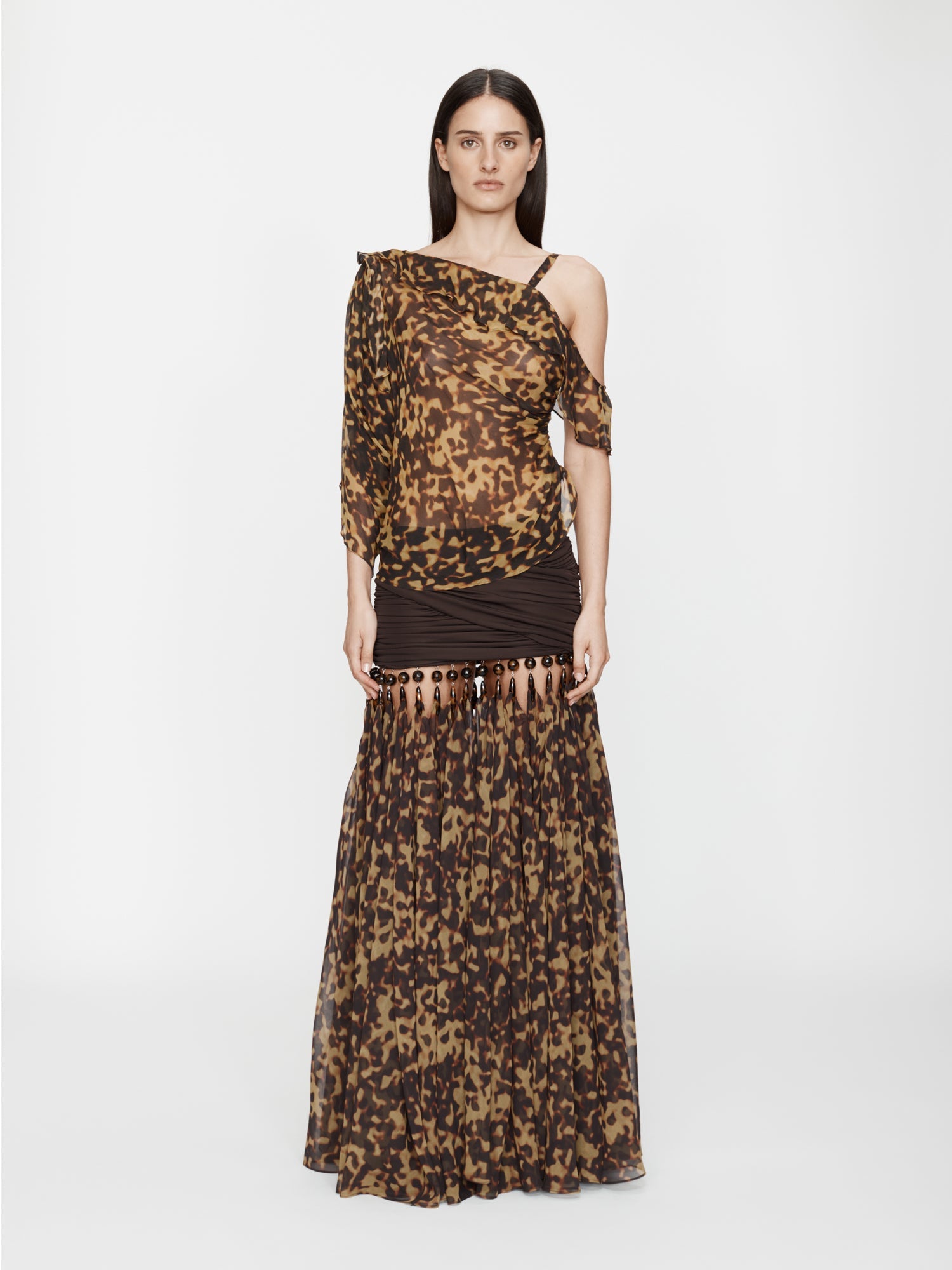 A ruched jersey waistband anchors sheer silk georgette, detailed with custom tortoiseshell resin droplets. The silhouette flows into a fluid, floor-length skirt, balancing sculptural hardware with movement.