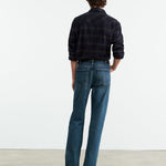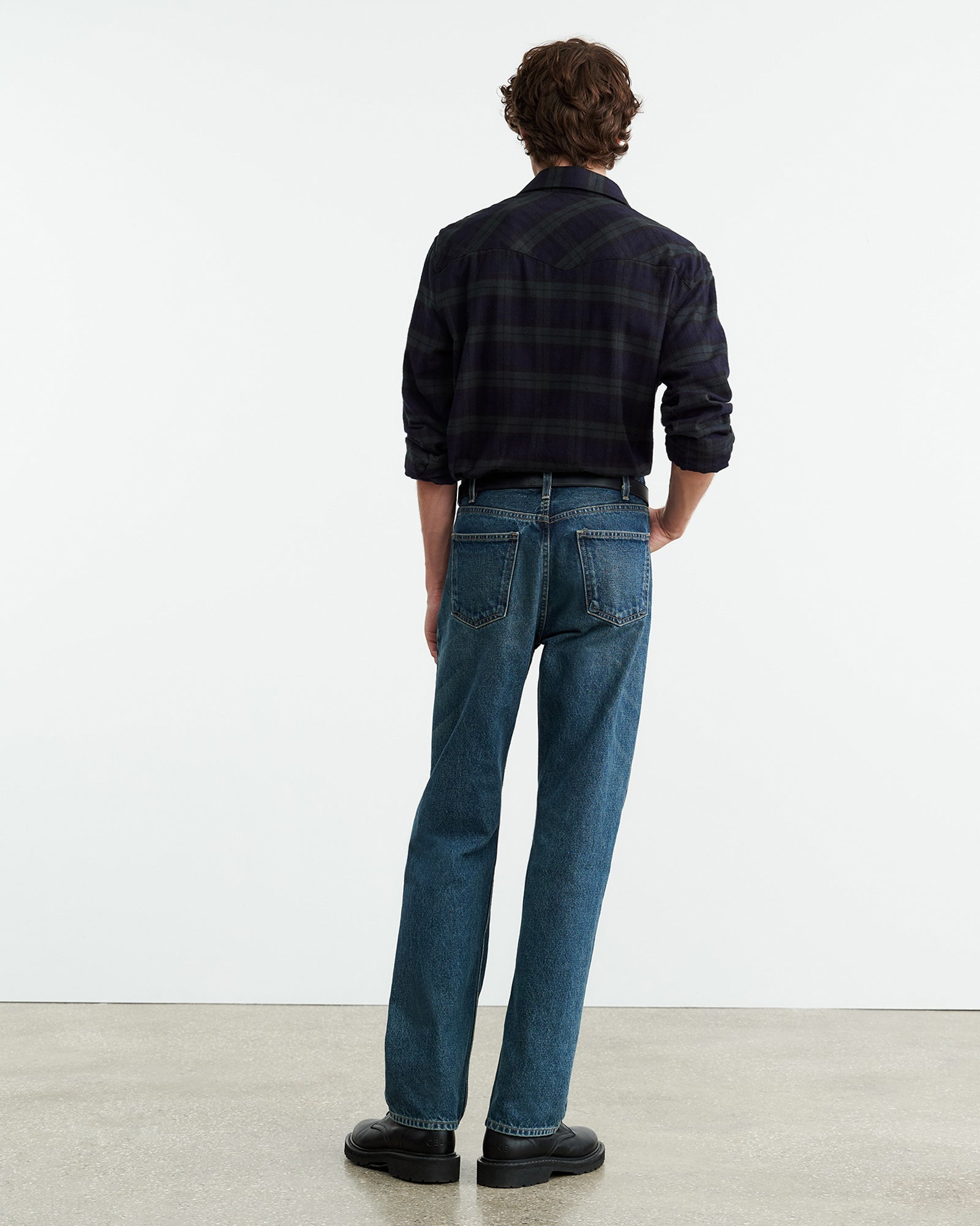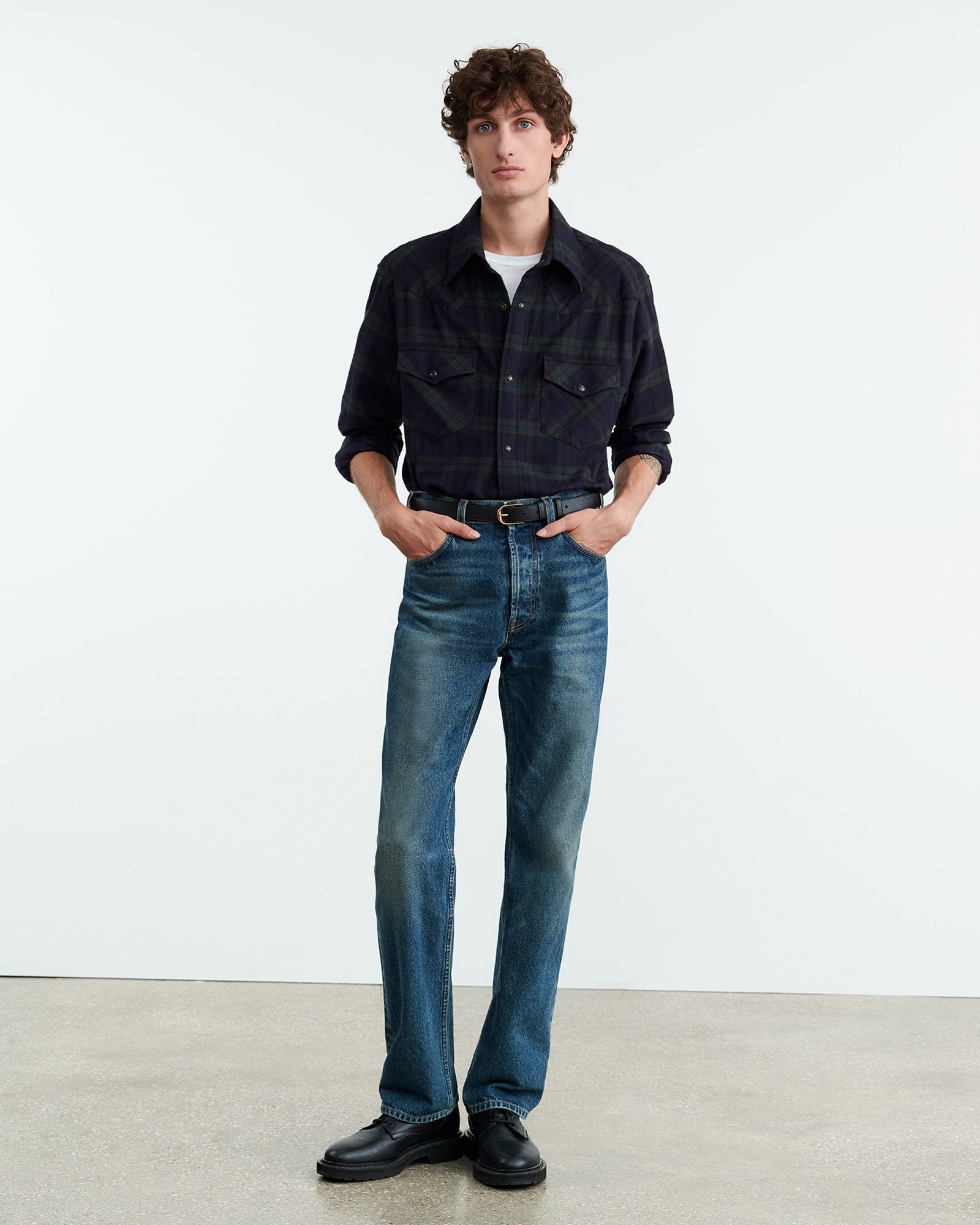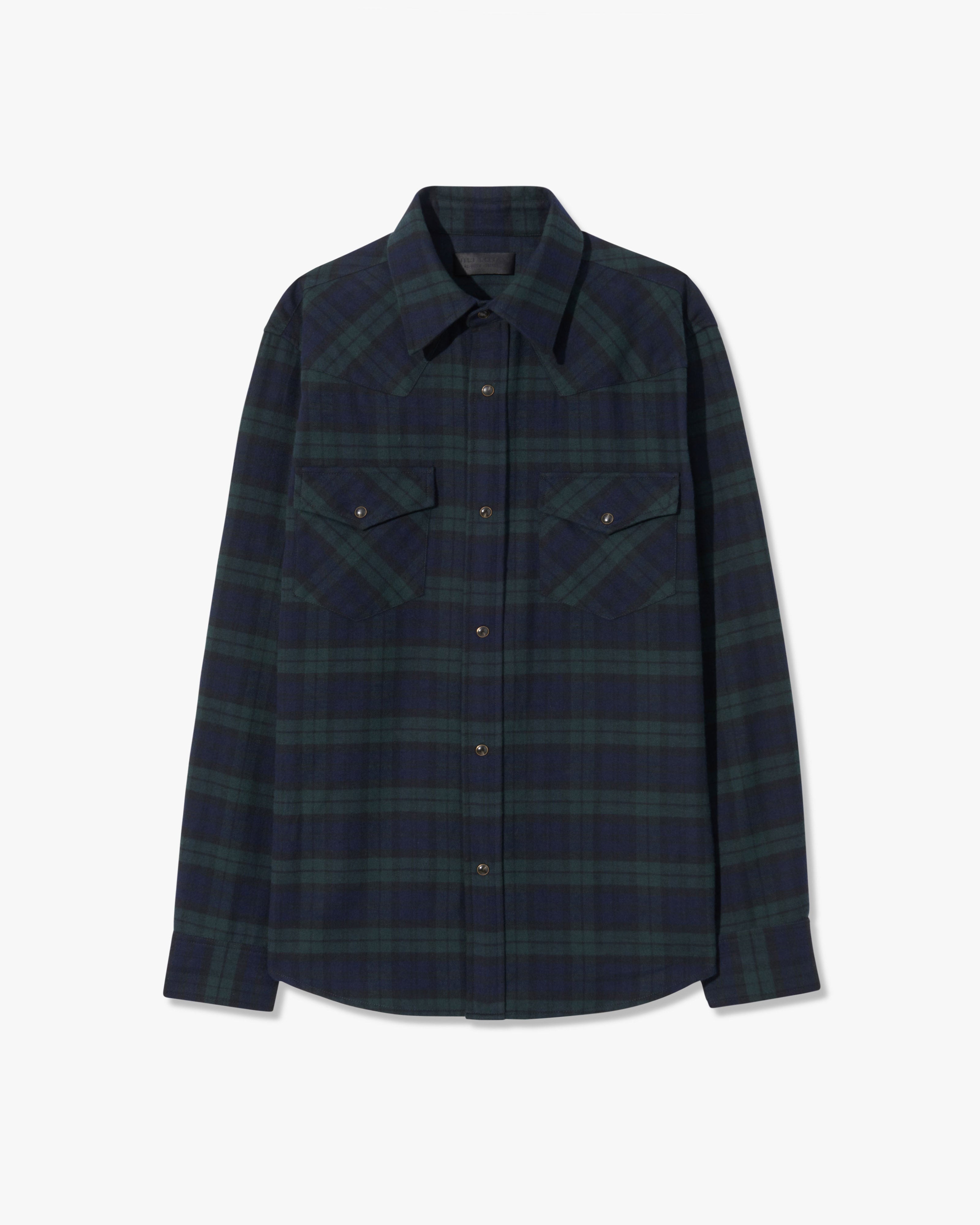 Classic, straight fit collared shirt. Western details. Pearl snap buttons. Chest flap pockets. Standard placket. Center front buttons. Buttons at cuff.