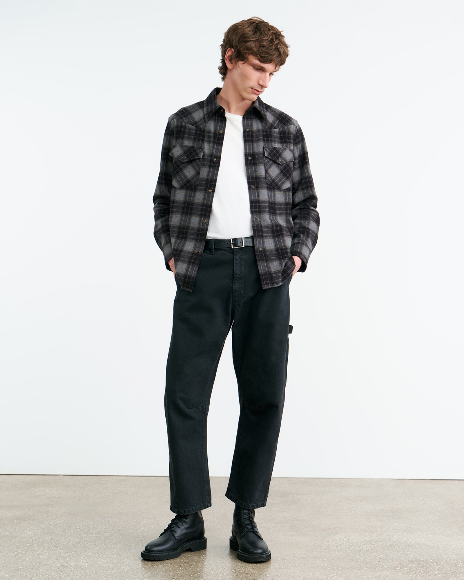 Classic, straight fit collared jean shirt. Western details. Pearl snap buttons. Chest flap pockets. Standard placket. Center front buttons. Buttons at cuff.