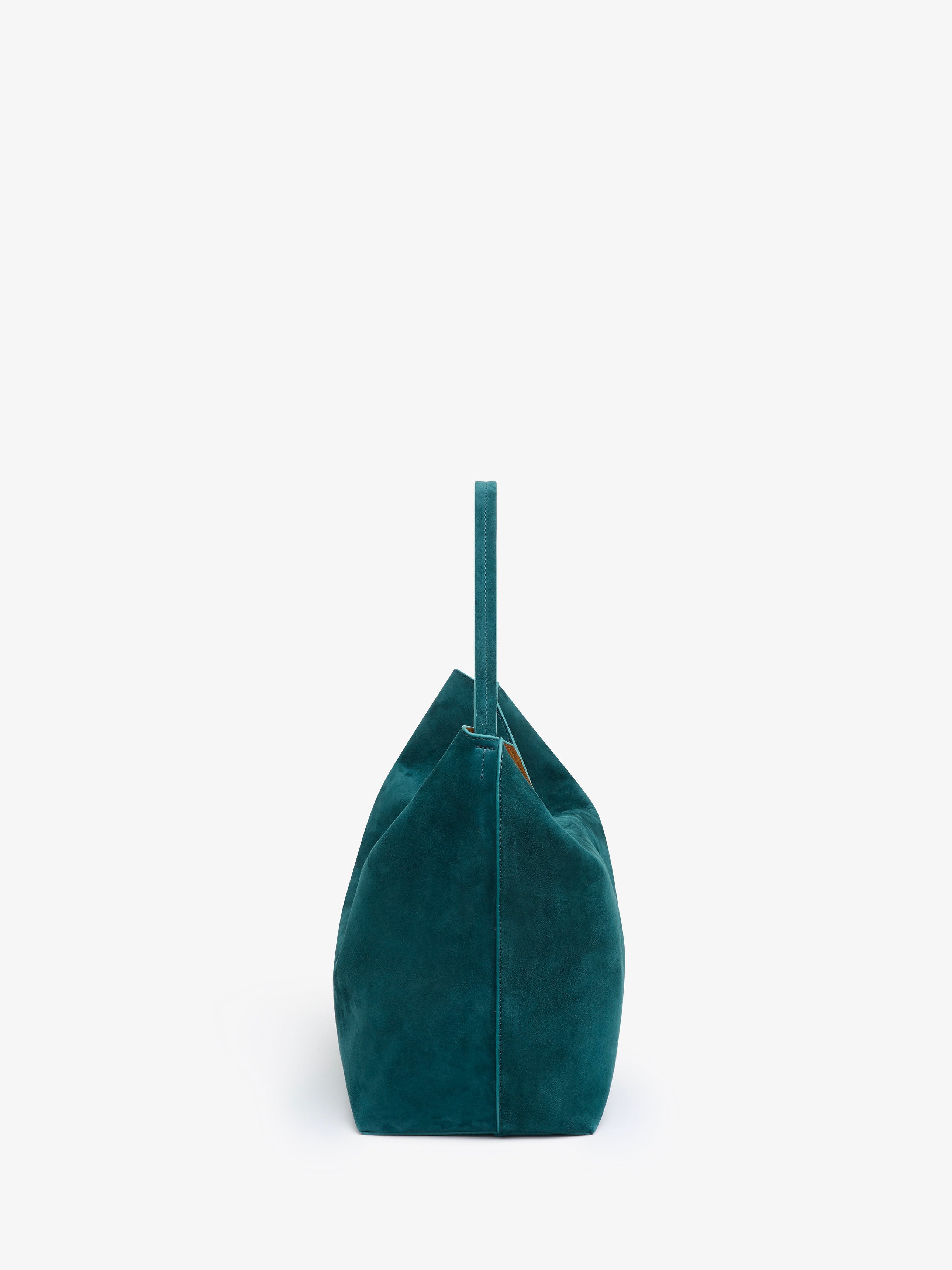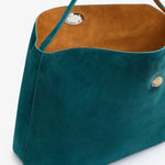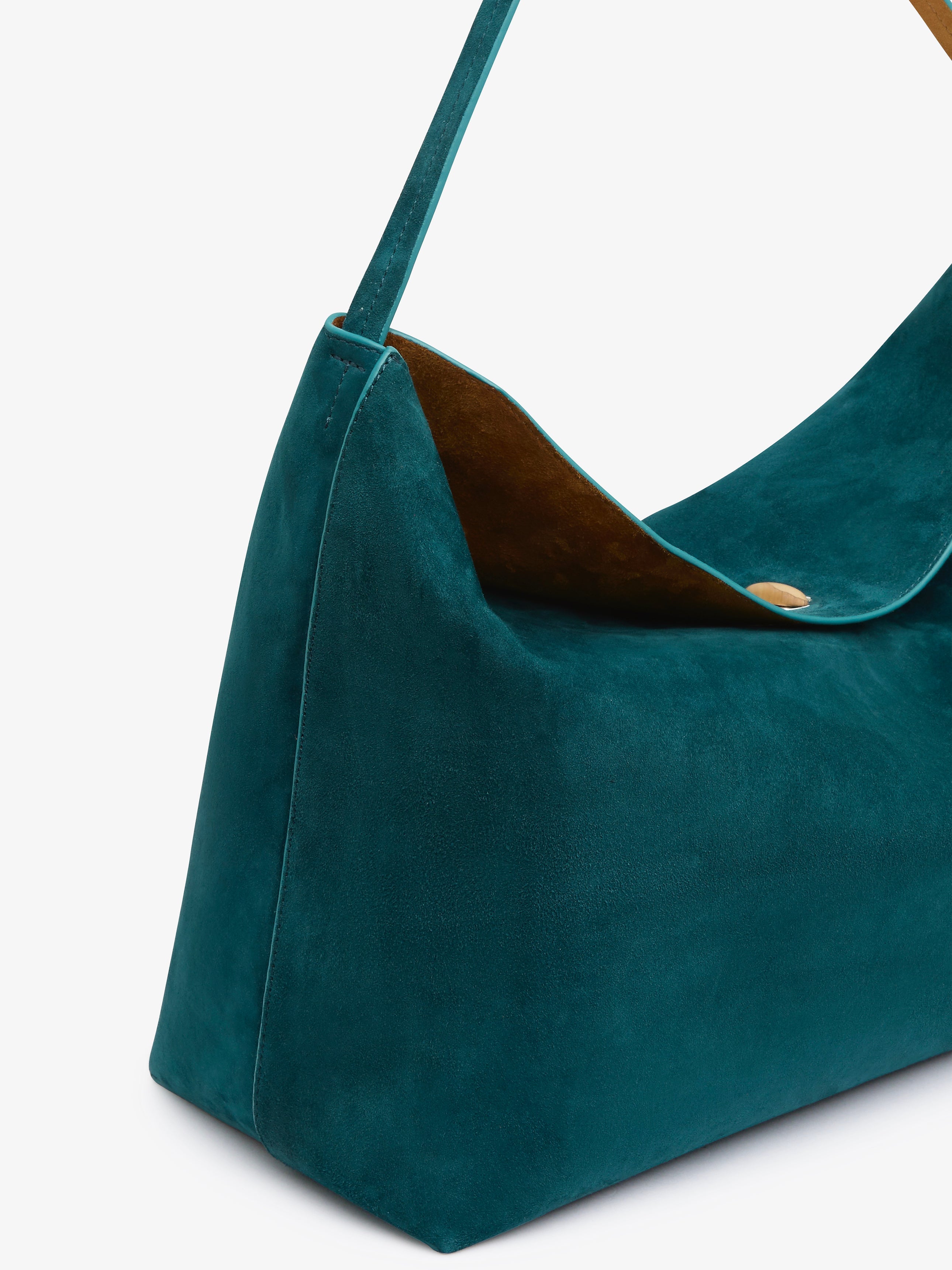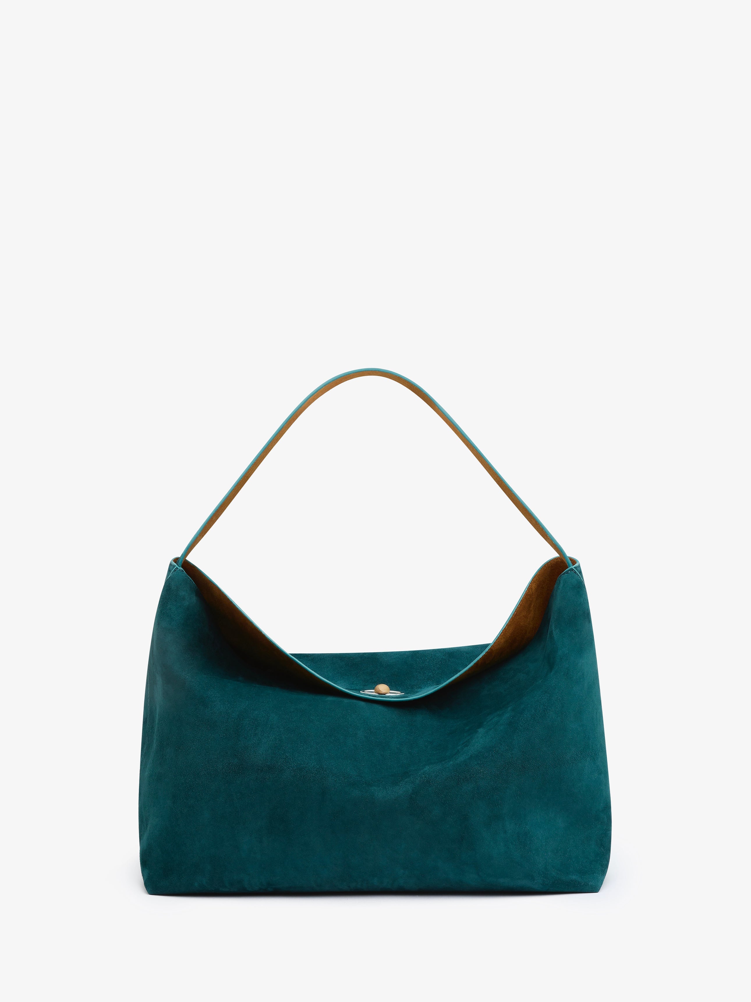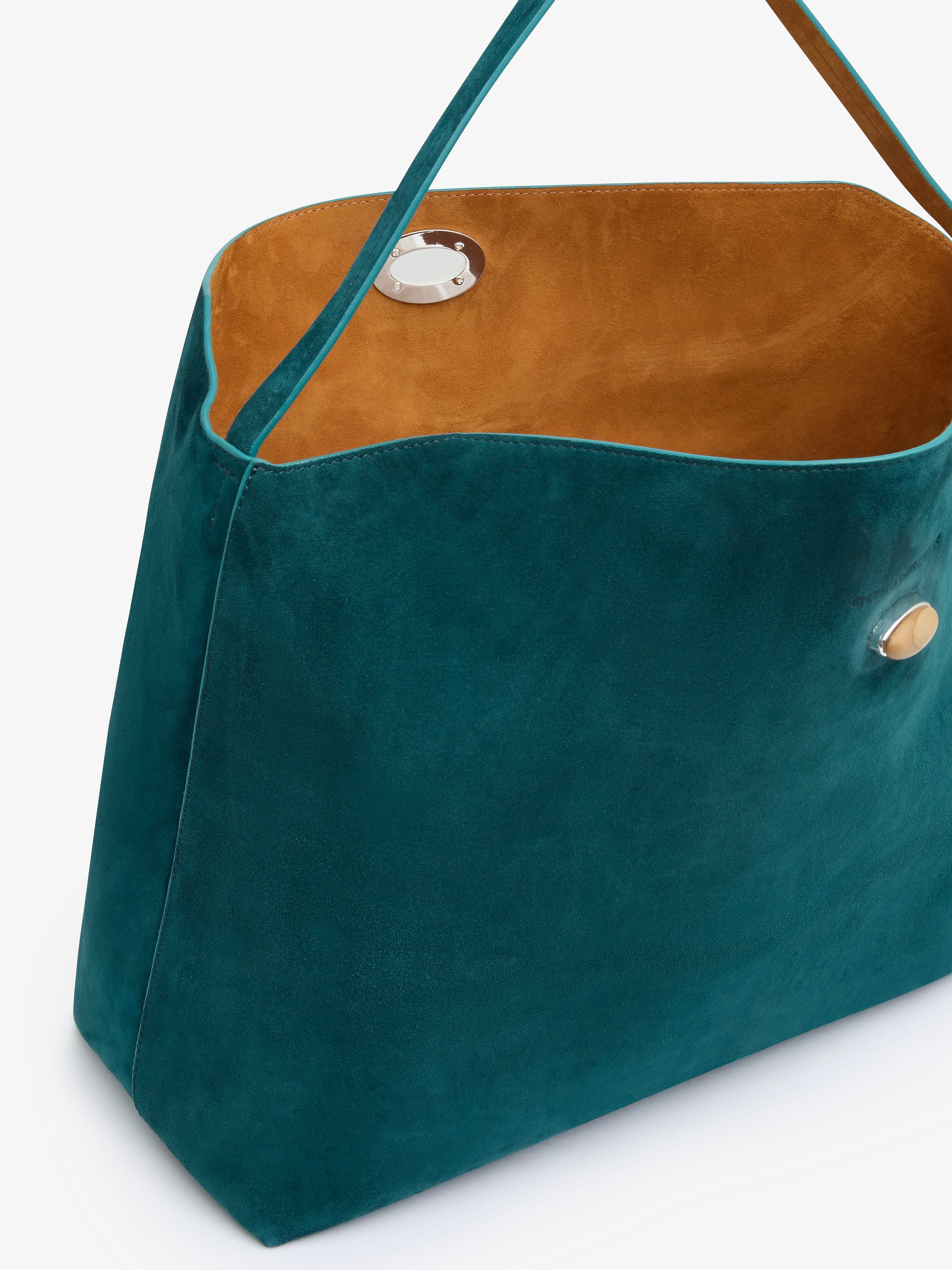 Constructed in a relaxed structure, this sculptural shoulder bag is crafted in rich teal green suede shaped to a softened trapeze silhouette and anchored by a Picture Jasper toggle, suspended in a high-shine silver frame.