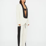 A fluid wide-leg trouser crafted in premium  silk with contrast tuxedo-inspired side panels. Designed with a mid-rise fit and minimal drawcord waist, the silhouette drapes with quiet structure - referencing tailoring codes through a relaxed lens.