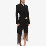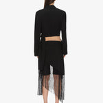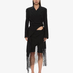 A wrap mini short spliced with hand-knotted macramé, falling into a fluid fringe detail. Cut in a clean tailored silhouette, the asymmetric overlay frames intricate craftsmanship against sharp lines. Elevated, minimal, and designed with textural tension.
