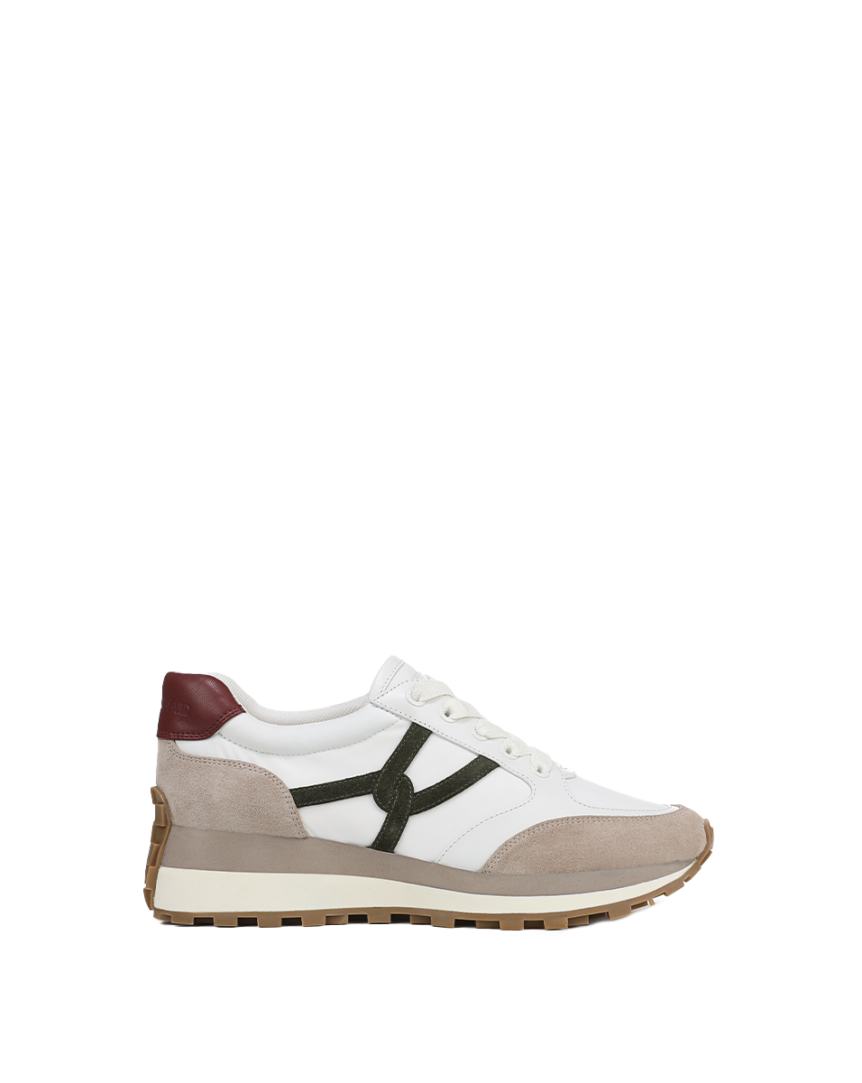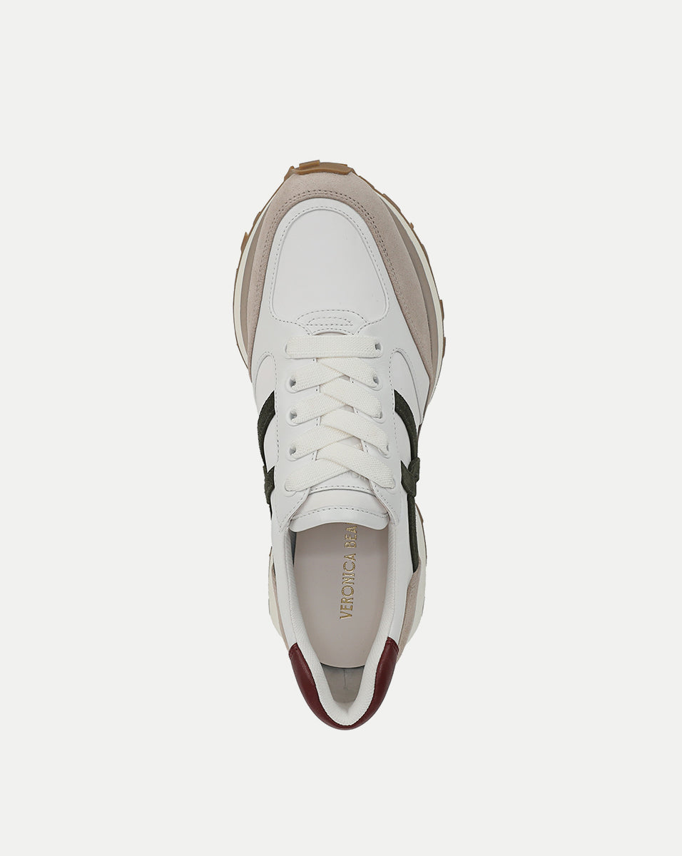The Valentina sneaker combines flattering lines and comfort: a padded collar, a cushioned midsole with a one-inch lift, a rubber outsole for grip, and suede details in the toe cap and back. The interlocking-V design, also in suede, is a discreet nod to our logo. Equal parts sporty and chic, this lightweight, two-tone design will be your new go-to for days on the move. As part of our tennis capsule in collaboration with activewear brand HEAD Sportswear, we’ve reimagined this VB best-seller in a chic muted color palette of white and taupe with hints of dark green and burgundy. We’ve also added nylon panel details to the leather body for a sportier feel.
