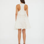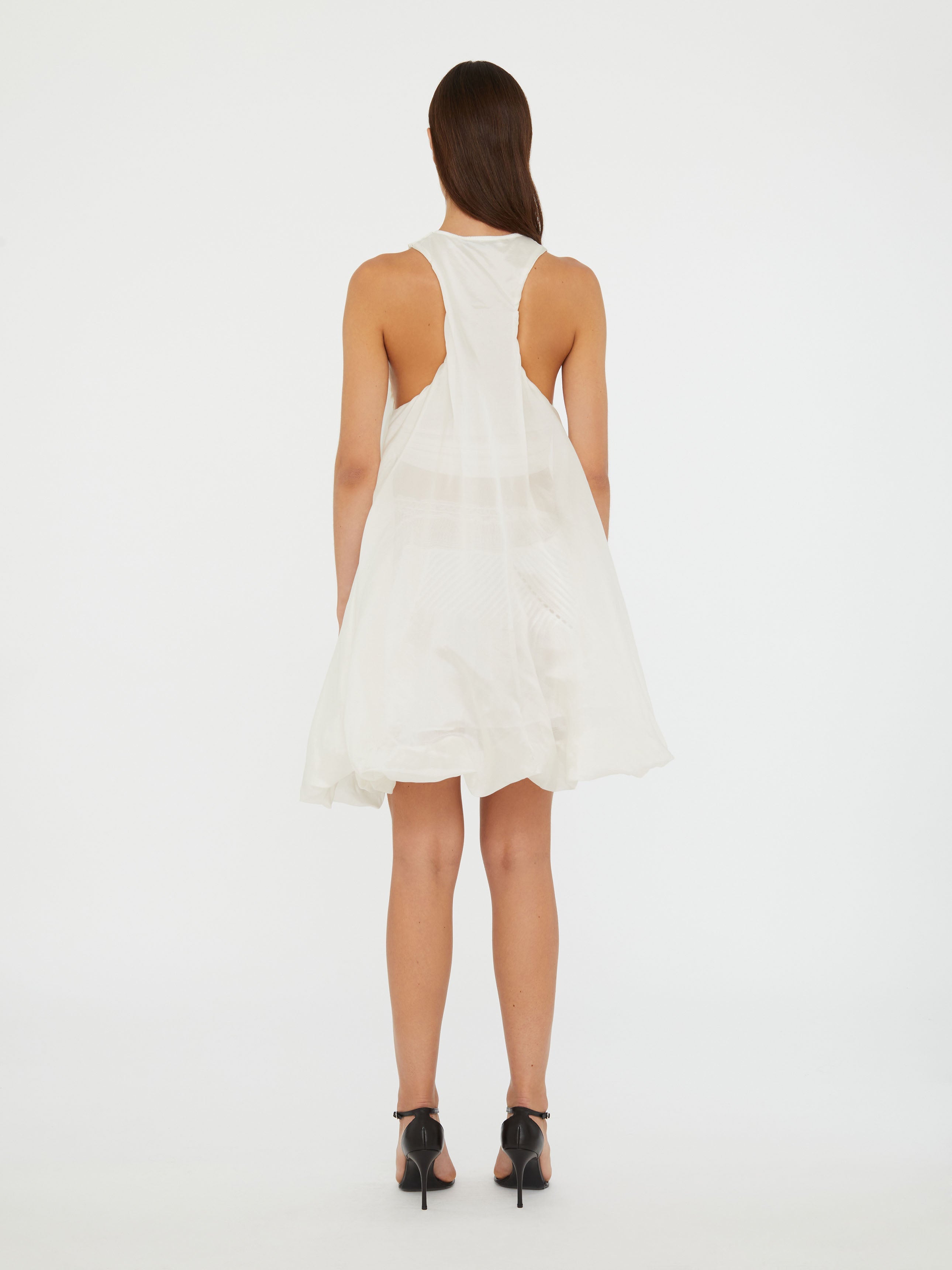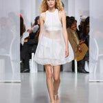 Cotton muslin with pintuck and lace placement is panelled together with super fine silk organza to reveal the laborious detailing of underlayers.