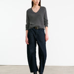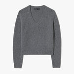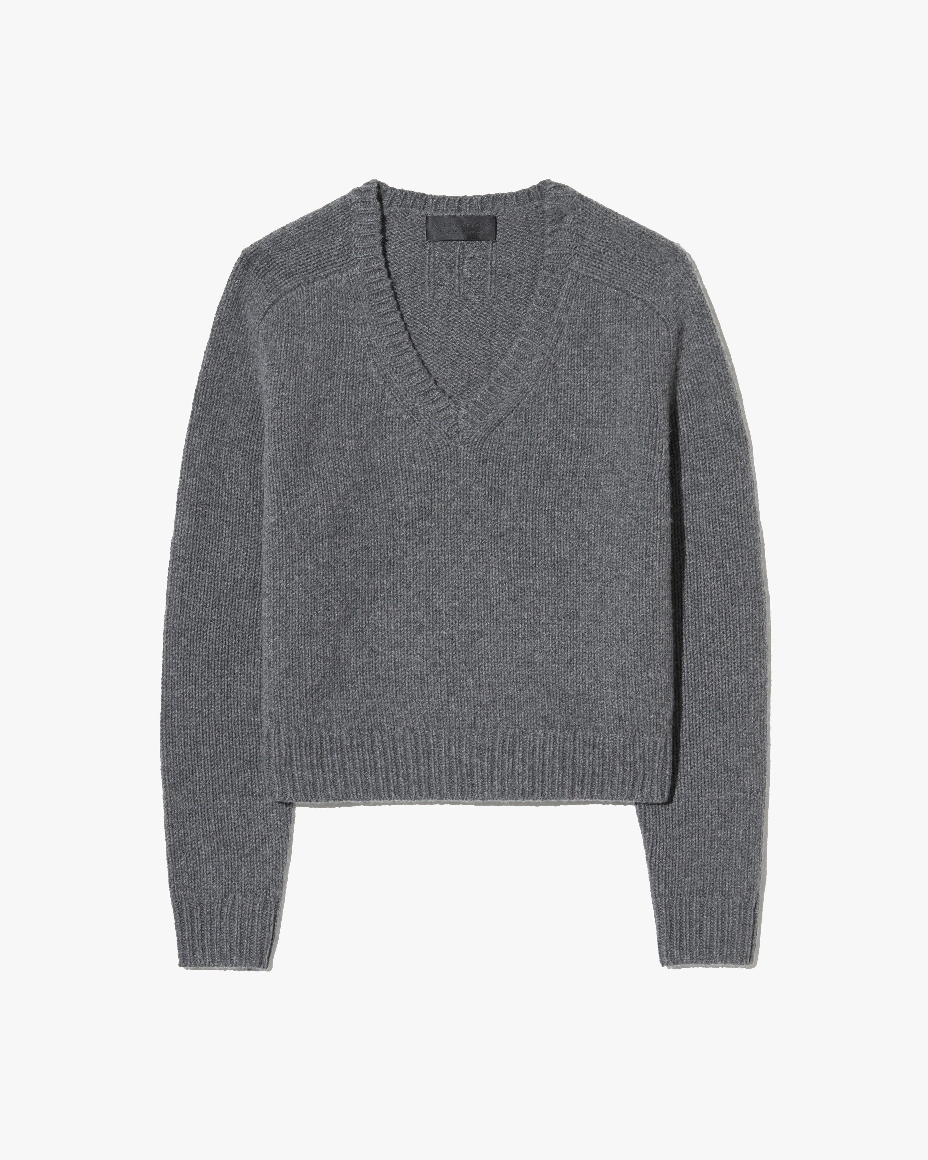 Long sleeve v-neck pullover sweater in a cashmere wool blend. Medium weight in jersey stitch. Shrunken fit. Short length. Regular length saddle sleeve. 1x1 rib at hem and cuff. Neck trim in 1x1 rib. Fashioning at sleeve and neckline. Signature center back cable knit detail.