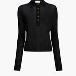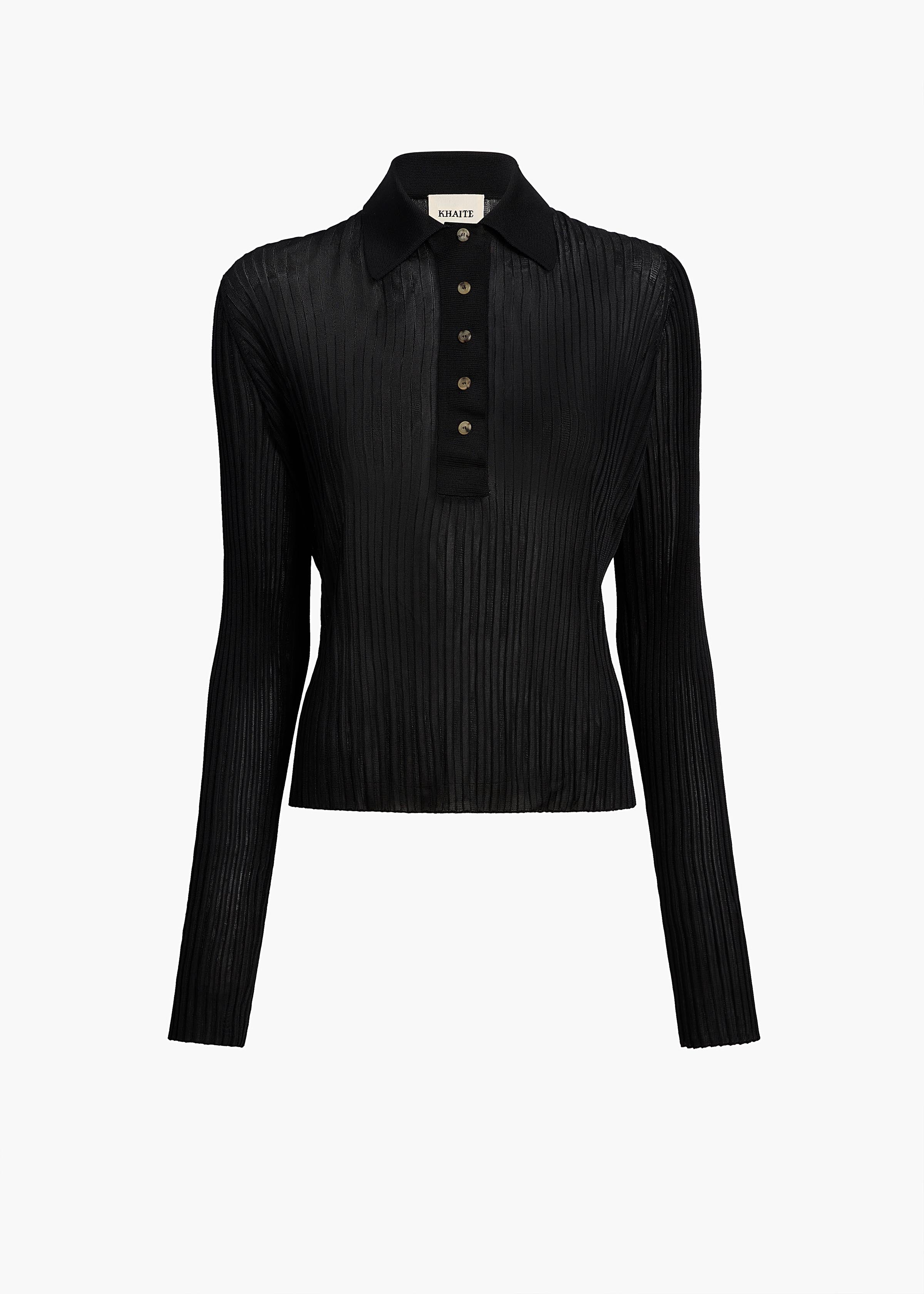 A finely ribbed, long-sleeved knit polo in fine Italian viscose selected for its luminous fluidity. Full Milano stitch placket and collar. Tortoiseshell buttons.