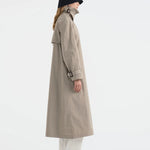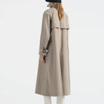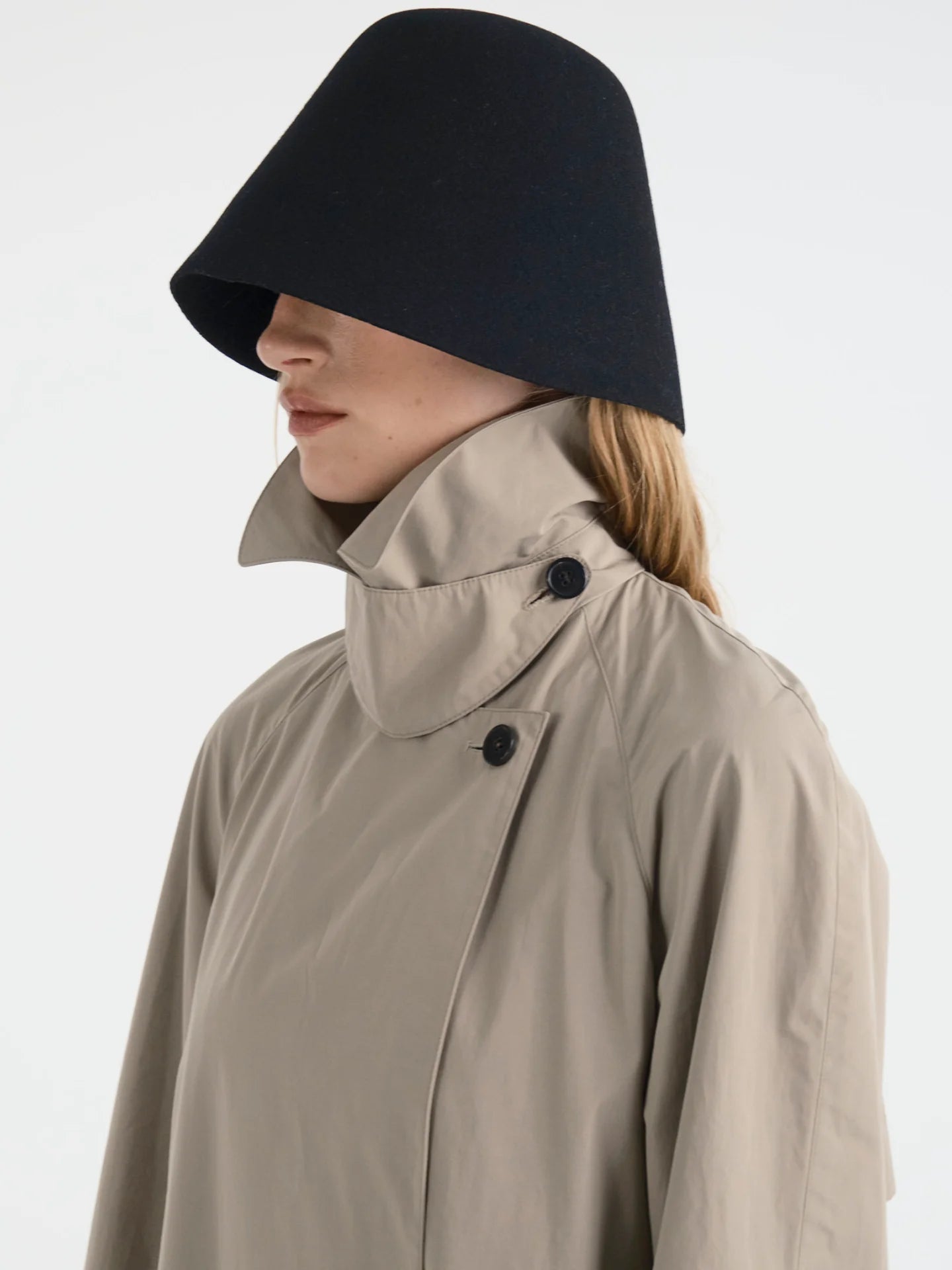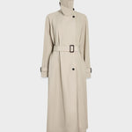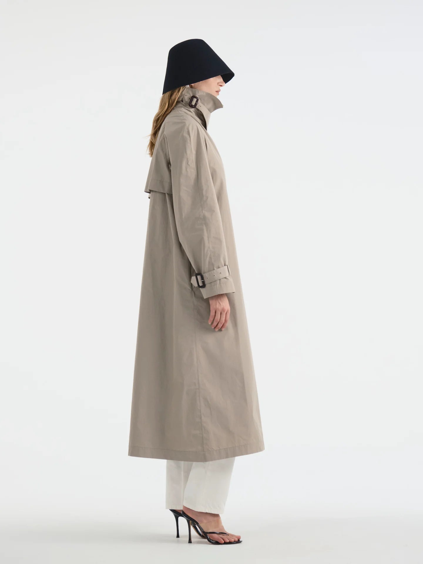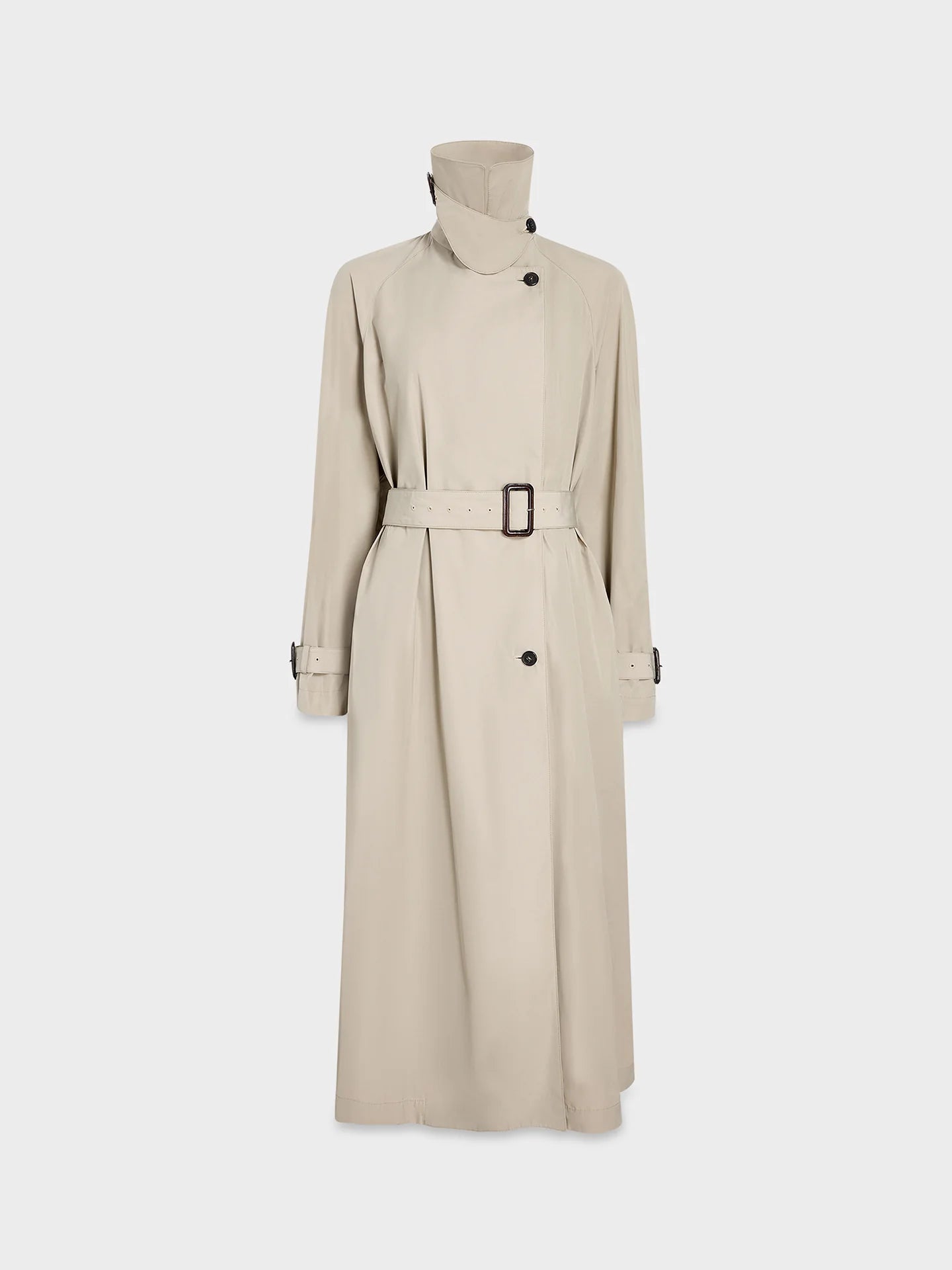 A soft-tailored, single-breasted a-line trench coat with horn buttons, an ulter collar, neck buckle closure, and relaxed raglan sleeves. Cut from crisp Italian cotton-nylon for subtle shine and a structured yet fluid drape. Complete with a back storm flap, adjustable cuffs, detachable belt, and a center back vent.