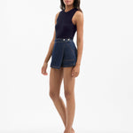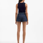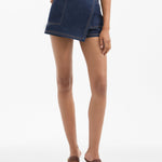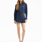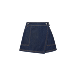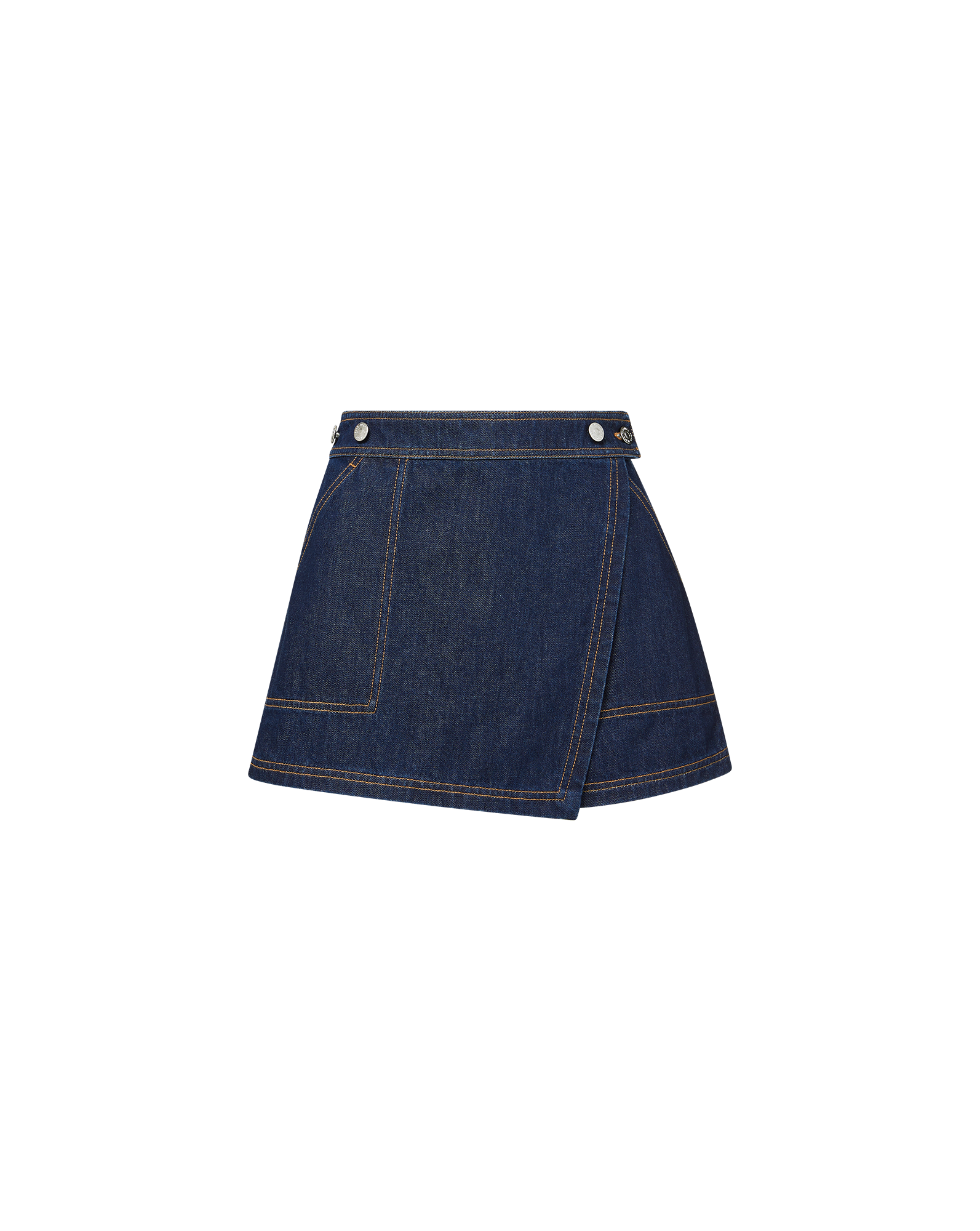Skirt from the front, shorts from the back. Expertly made from non-stretch Japanese cotton in a dark indigo wash, the A-line Winslet skort features a wrap-style silhouette, a high waist, a mini hemline, and a set of pockets in the front and back. This will be a new favorite for weekends and vacations alike. Pair with the Patty jacket for a chic take on double denim.